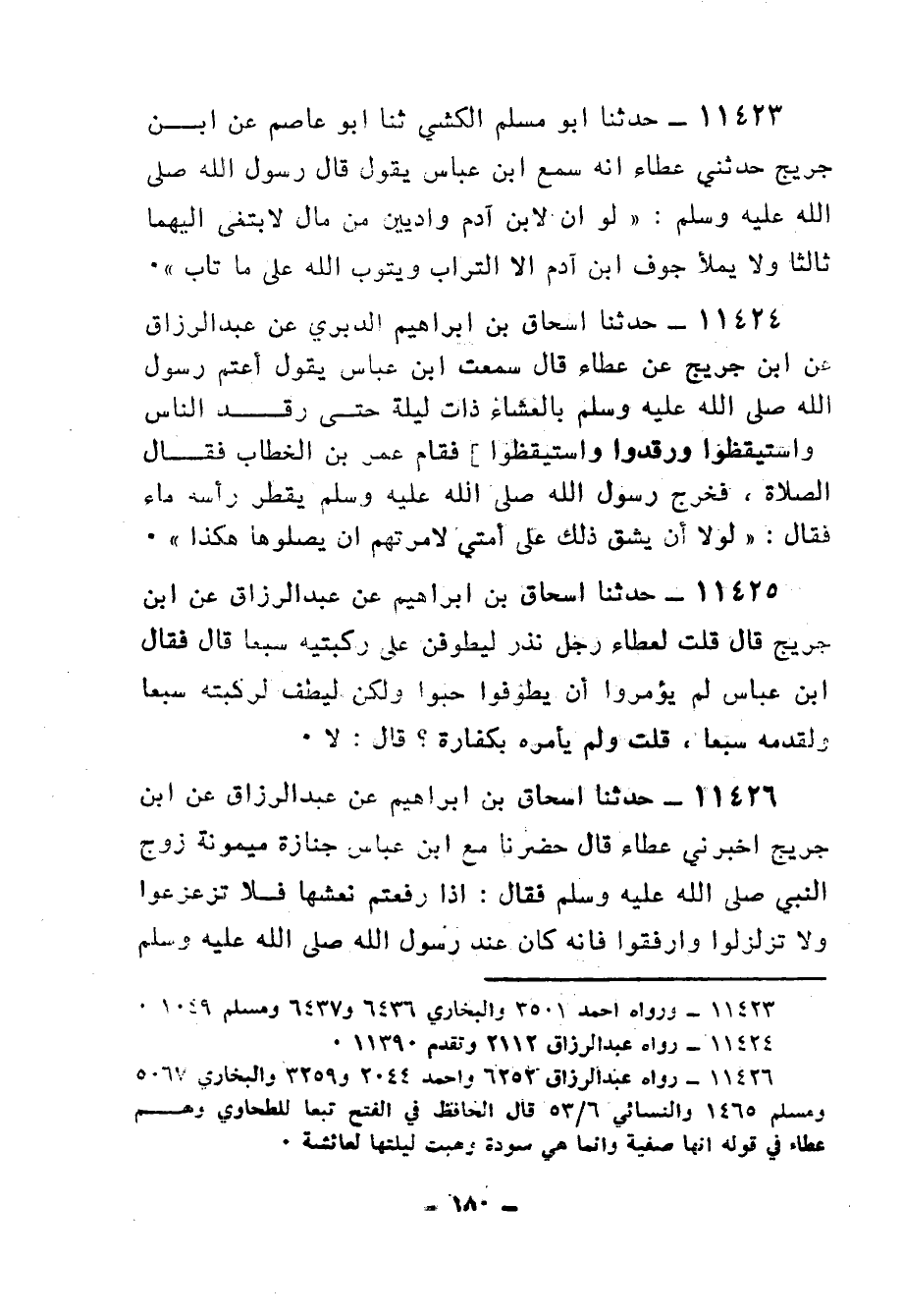 11423 - حَدَّثَنَا أَبُو مُسْلِمٍ الْكَشِّيُّ، ثنا أَبُو عَاصِمٍ، عَنِ ابْنِ جُرَيْجٍ، حَدَّثَنِي عَطَاءٌ، أَنَّهُ سَمِعَ ابْنَ عَبَّاسٍ يَقُولُ: قَالَ رَسُولُ اللهِ صَلَّى اللهُ عَلَيْهِ وَسَلَّمَ: «§لَوْ أَنَّ لِابْنِ آدَمَ وَادِيَيْنِ مِنْ مَالٍ لَابْتَغَى إِلَيْهِمَا ثَالِثًا، وَلَا يَمْلَأُ جَوْفَ ابْنِ آدَمَ إِلَّا التُّرَابُ وَيَتُوبُ اللهُ عَلَى مَنْ تَابَ»
