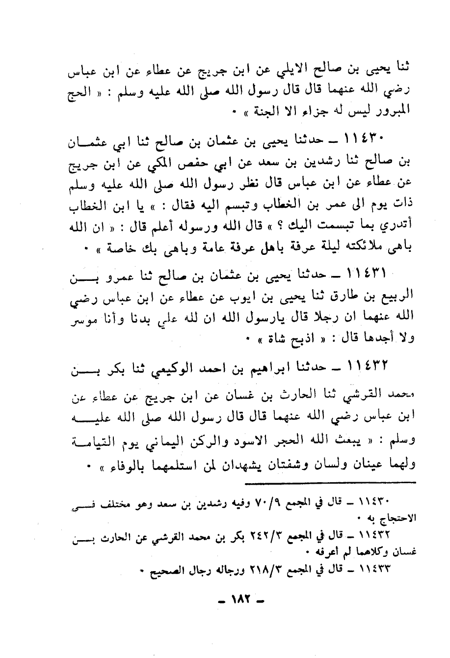 11432 - حَدَّثَنَا إِبْرَاهِيمُ بْنُ أَحْمَدَ الْوَكِيعِيُّ، ثنا بَكْرُ بْنُ مُحَمَّدٍ الْقُرَشِيُّ، ثنا الْحَارِثُ بْنُ غَسَّانَ، عَنِ ابْنِ جُرَيْجٍ، عَنْ عَطَاءٍ، عَنِ ابْنِ عَبَّاسٍ رَضِي اللهُ عَنْهُمَا، قَالَ: قَالَ رَسُولُ اللهِ صَلَّى اللهُ عَلَيْهِ وَسَلَّمَ: «§يَبْعَثُ اللهُ الْحَجَرَ الْأَسْوَدَ، وَالرُّكْنَ الْيَمَانِيَّ يَوْمَ الْقِيَامَةِ، وَلَهُمَا عَيْنَانِ وَلِسَانٌ وَشَفَتَانِ يَشْهَدَانِ لِمَنِ اسْتَلَمَهُما بِالْوَفَاءِ»