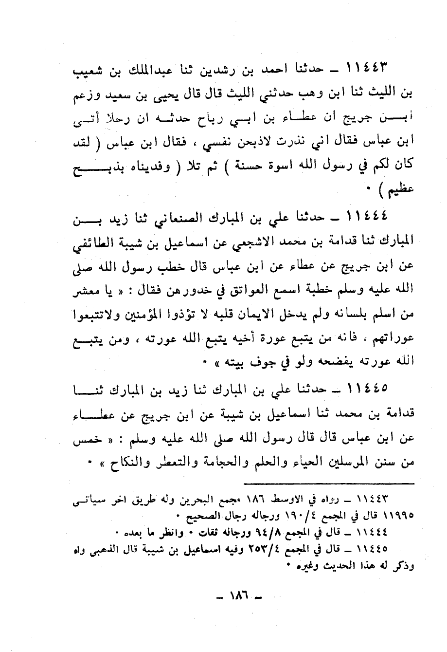 11445 - حَدَّثَنَا عَلِيُّ بْنُ الْمُبَارَكِ، ثنا زَيْدُ بْنُ الْمُبَارَكِ، ثنا قُدَامَةُ بْنُ مُحَمَّدٍ، ثنا إِسْمَاعِيلُ بْنُ شَيْبَةَ، عَنِ ابْنِ جُرَيْجٍ، عَنْ عَطَاءٍ، عَنِ ابْنِ عَبَّاسٍ، قَالَ: قَالَ رَسُولُ اللهِ صَلَّى اللهُ عَلَيْهِ وَسَلَّمَ: " §خَمْسٌ مِنْ سُنَنِ الْمُرْسَلِينَ: الْحَيَاءُ، وَالْحِلْمُ، وَالْحِجَامَةُ، وَالتَّعَطُّرُ، وَالنِّكَاحُ "