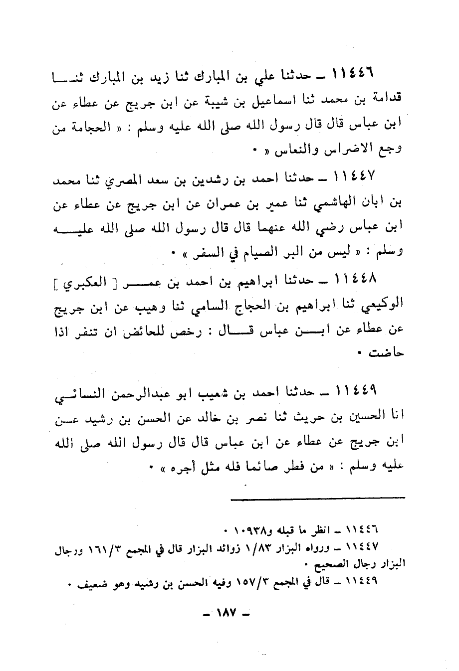 11446 - حَدَّثَنَا عَلِيُّ بْنُ الْمُبَارَكِ، ثنا زَيْدُ بْنُ الْمُبَارَكِ، ثنا قُدَامَةُ بْنُ مُحَمَّدٍ، ثنا إِسْمَاعِيلُ بْنُ شَيْبَةَ، عَنِ ابْنِ جُرَيْجٍ، عَنْ عَطَاءٍ، عَنِ ابْنِ عَبَّاسٍ، قَالَ: قَالَ رَسُولُ اللهِ صَلَّى اللهُ عَلَيْهِ وَسَلَّمَ: «§الْحِجَامَةُ مِنْ وَجَعِ الْأَضْرَاسِ وَالنُّعَاسِ»