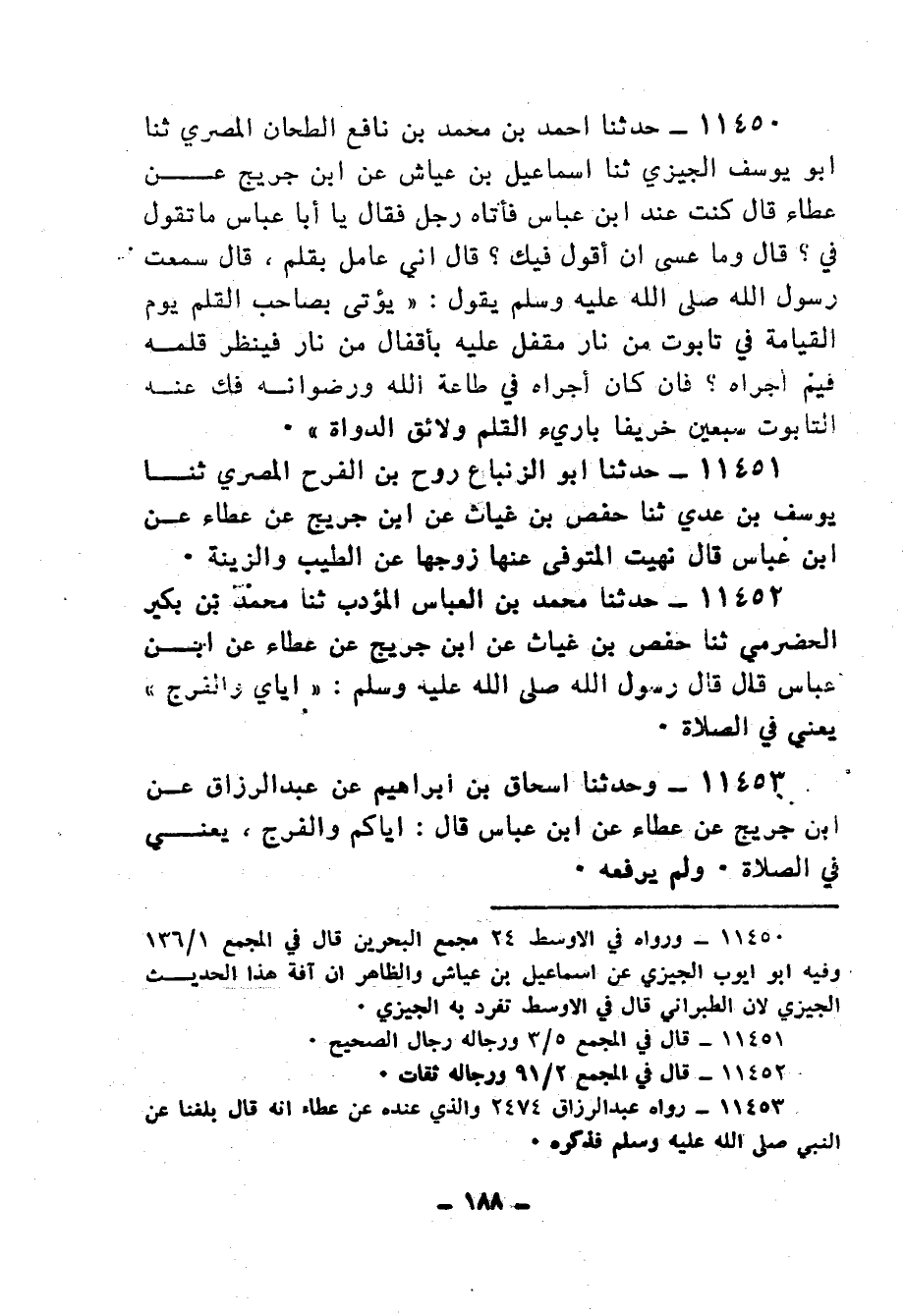 11450 - حَدَّثَنَا أَحْمَدُ بْنُ مُحَمَّدِ بْنِ نَافِعٍ الطَّحَّانُ الْمِصْرِيُّ، ثنا أَبُو يُوسُفَ الْجِيزِيُّ، ثنا إِسْمَاعِيلُ بْنُ عَيَّاشٍ، عَنِ ابْنِ جُرَيْجٍ، عَنْ عَطَاءٍ، قَالَ: كُنْتُ عِنْدَ ابْنِ عَبَّاسٍ فَأَتَاهُ رَجُلٌ فَقَالَ: يَا أَبَا عَبَّاسٍ، مَا تَقُولُ فِيَّ؟ قَالَ: وَمَا عَسَى أَنْ أَقُولَ فِيكَ؟ قَالَ: إِنِّي عَامَلٌ بقلمٍ، قَالَ: سَمِعْتُ رَسُولَ اللهِ صَلَّى اللهُ عَلَيْهِ وَسَلَّمَ يَقُولُ: «§يُؤْتَى بِصَاحِبِ الْقَلَمِ يَوْمَ الْقِيَامَةِ فِي تابوتٍ مِنْ نَارٍ مُقْفَلٍ عَلَيْهِ بِأَقْفَالٍ مِنْ نَارٍ فَيَنْظُرُ قَلَمَهُ فِيمَ أَجْرَاهُ، فَإِنْ كَانَ أَجْرَاهُ فِي طَاعَةِ اللهِ وَرِضْوَانِهِ فُكَّ عَنْهُ التَّابُوتُ، وَإِنْ أَجْرَاهُ فِي مَعْصِيَةِ اللهِ هَوَى بِهِ التَّابُوتُ سَبْعِينَ خَرِيفًا حَتَّى بارئُ الْقَلَمِ ولائقُ الدَّوَاةِ»
