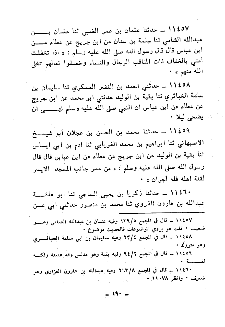 11459 - حَدَّثَنَا مُحَمَّدُ بْنُ الْحَسَنِ بْنِ عَجْلَانَ أَبُو شَيْخٍ الْأَصْبَهَانِيُّ، ثنا إِبْرَاهِيمُ بْنُ مُحَمَّدٍ الْفِرْيَابِيُّ، ثنا آدَمُ بْنُ أَبِي إِيَاسٍ، ثنا بَقِيَّةُ بْنُ الْوَلِيدِ، عَنِ ابْنِ جُرَيْجٍ، عَنْ عَطَاءٍ، عَنِ ابْنِ عَبَّاسٍ، قَالَ: قَالَ رَسُولُ اللهِ صَلَّى اللهُ عَلَيْهِ وَسَلَّمَ: «§مَنْ عَمَّرَ جَانِبَ الْمَسْجِدِ الْأَيْسَرَ لِقِلَّةِ أَهْلِهِ، فَلَهُ أَجْرَانِ»