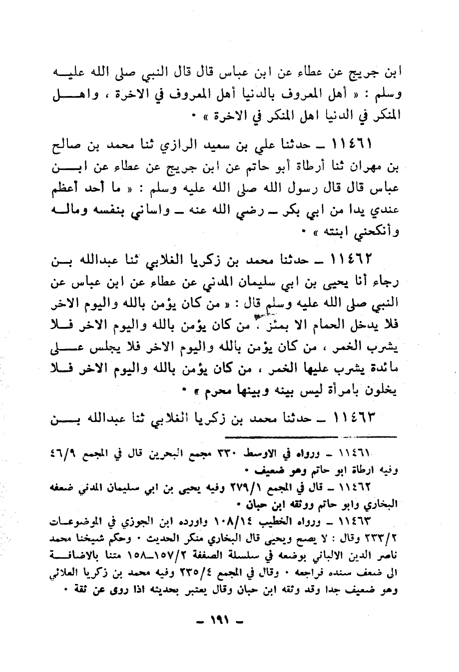 11462 - حَدَّثَنَا مُحَمَّدُ بْنُ زَكَرِيَّا الْغَلَابِيُّ، ثنا عَبْدُ اللهِ بْنُ رَجَاءٍ، أَنَا يَحْيَى بْنُ أَبِي سُلَيْمَانَ الْمَدَنِيُّ، عَنْ عَطَاءٍ، عَنِ ابْنِ عَبَّاسٍ، عَنِ النَّبِيِّ صَلَّى اللهُ عَلَيْهِ وَسَلَّمَ قَالَ: «§مَنْ كَانَ يُؤْمِنُ بِاللهِ وَالْيَوْمِ الْآخِرِ، فَلَا يَدْخُلِ الْحَمَّامَ إِلَّا بِمِئْزَرٍ، مَنْ كَانَ يُؤْمِنُ بِاللهِ وَالْيَوْمِ الْآخِرِ فَلَا يَشْرَبِ الْخَمْرَ، مَنْ كَانَ يُؤْمِنُ بِاللهِ وَالْيَوْمِ الْآخِرِ فَلَا يَجْلِسْ عَلَى مَائِدَةٍ يُشْرَبُ عَلَيْهَا الْخَمْرُ، مَنْ كَانَ يُؤْمِنُ بِاللهِ وَالْيَوْمِ الْآخِرِ فَلَا يَخْلُوَنَّ بِامْرَأَةٍ لَيْسَ بَيْنَهُ وَبَيْنَهَا مَحْرَمٌ»