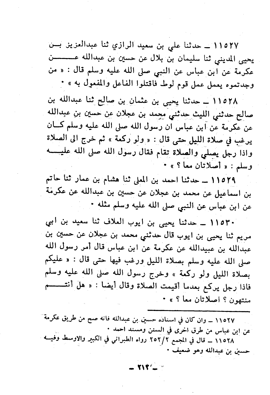 11530 - حَدَّثَنَا يَحْيَى بْنُ أَيُّوبَ الْعَلَّافُ، ثنا سَعِيدُ بْنُ أَبِي مَرْيَمَ، ثنا يَحْيَى بْنُ أَيُّوبَ، قَالَ: حَدَّثَنِي مُحَمَّدُ بْنُ عَجْلَانَ، عَنْ حُسَيْنِ بْنِ عَبْدِ اللهِ بْنِ عُبَيْدِ اللهِ، عَنْ عِكْرِمَةَ، عَنِ ابْنِ عَبَّاسٍ، قَالَ: أَمَرَ رَسُولُ اللهِ صَلَّى اللهُ عَلَيْهِ وَسَلَّمَ بِصَلَاةِ اللَّيْلِ وَرَغَّبَ فِيهَا حَتَّى قَالَ: «§عَلَيْكُمْ بِصَلَاةِ اللَّيْلِ وَلَوْ رَكْعَةً» ، وَخَرَجَ رَسُولُ اللهِ صَلَّى اللهُ عَلَيْهِ وَسَلَّمَ، فَإِذَا رَجُلٌ يَرْكَعُ بَعْدَمَا أُقِيمَتِ الصَّلَاةُ وَقَالَ أَيْضًا: «هَلْ أَنْتُمْ مُنْتَهُونَ، أَصَلَاتَانِ مَعًا؟»