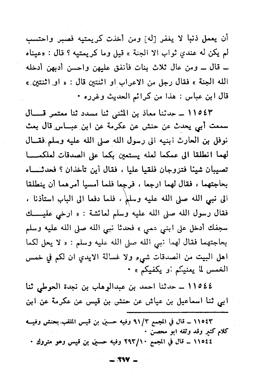 11543 - حَدَّثَنَا مُعَاذُ بْنُ الْمُثَنَّى، ثنا مُسَدَّدٌ، ثنا مُعْتَمِرٌ، قَالَ: سَمِعْتُ أَبِي يُحَدِّثُ، عَنْ حَنَشٍ، عَنْ عِكْرِمَةَ، عَنِ ابْنِ عَبَّاسٍ، قَالَ: بَعَثَ نَوْفَلُ بْنُ الْحَارِثِ ابْنَيْهِ إِلَى رَسُولِ اللهِ صَلَّى اللهُ عَلَيْهِ وَسَلَّمَ فَقَالَ لَهُمَا: انْطَلِقَا إِلَى عَمِّكُمَا لَعَلَّهُ يَسْتَعِينُ بِكُمَا عَلَى الصَّدَقَاتِ لَعَلَّكُمَا تُصيبانِ شَيْئًا فتزوجانِ فَلَقِيَا عَلِيًّا فَقَالَ: أَيْنَ تَأْخُذَانِ؟ فَحَدَّثَاهُ بحاجَتِهما فَقَالَ لَهُمَا: ارْجِعَا فَرَجَعَا، فَلَمَّا أَمْسَيَا أَمَرَهُمَا أَنْ يَنْطَلِقا إِلَى نَبِيِّ اللهِ صَلَّى اللهُ عَلَيْهِ وَسَلَّمَ، فَلَمَّا دَفَعَا إِلَى الْبَابِ اسْتَأْذَنا، فَقَالَ رَسُولُ اللهِ صَلَّى اللهُ عَلَيْهِ وَسَلَّمَ لِعَائِشَةَ: «أَرْخِي عَلَيْكِ سجفَكِ أُدْخِلُ عَلَيَّ ابْنَيْ عَمِّي» فَحَدَّثَا نَبِيَّ اللهِ صَلَّى اللهُ عَلَيْهِ وَسَلَّمَ بحاجَتِهما، فَقَالَ لَهُمَا نَبِيُّ اللهِ صَلَّى اللهُ عَلَيْهِ وَسَلَّمَ: «§لَا يَحِلُّ لَكُمَا أَهْلَ الْبَيْتِ منَ الصَّدَقَاتِ شَيْءٌ، وَلَا غُسَالَةُ الْأَيْدِي إِنَّ لَكُمْ فِي خُمْسِ الْخُمُسِ لَمَا يُغْنِيكُمْ أَوْ يَكْفِيكُمْ»