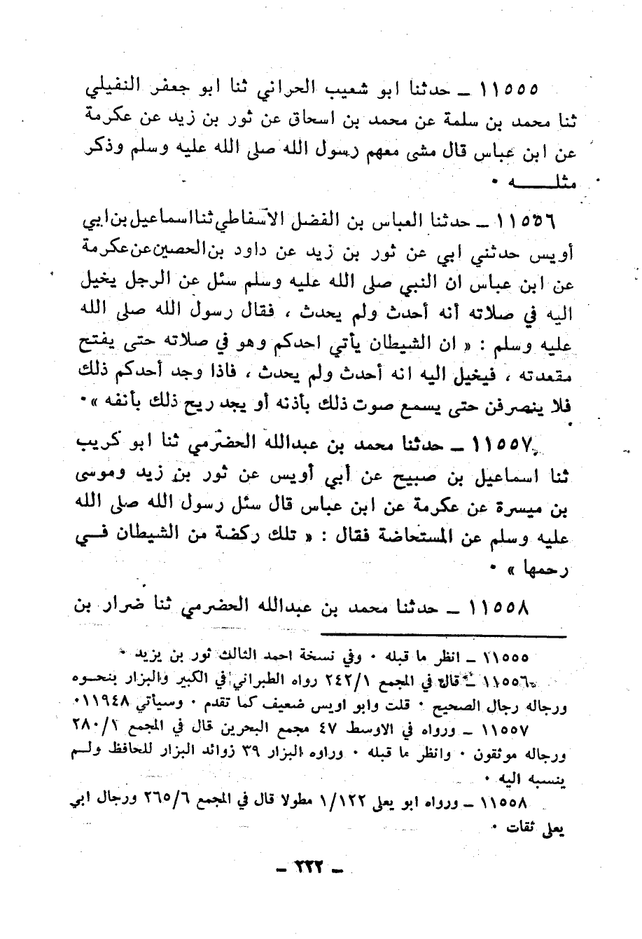 11556 - حَدَّثَنَا الْعَبَّاسُ بْنُ الْفَضْلِ الْأَسْفَاطِيُّ، ثنا إِسْمَاعِيلُ بْنُ أَبِي أُوَيْسٍ، حَدَّثَنِي أَبِي، عَنْ ثَوْرِ بْنِ زَيْدٍ، عَنْ دَاوُدَ بْنِ الْحُصَيْنِ، عَنْ عِكْرِمَةَ، عَنِ ابْنِ عَبَّاسٍ، أَنَّ النَّبِيَّ صَلَّى اللهُ عَلَيْهِ وَسَلَّمَ سُئِلَ عَنِ الرَّجُلِ يُخَيَّلُ إِلَيْهِ فِي صَلَاتِهِ أَنَّهُ أَحْدَثَ، وَلَمْ يُحْدِثْ فَقَالَ رَسُولُ اللهِ صَلَّى اللهُ عَلَيْهِ وَسَلَّمَ: «إِنَّ §الشَّيْطَانَ يَأْتِي أَحَدَكُمْ، وَهُوَ فِي صَلَاتِهِ حَتَّى يَفْتَحَ مَقْعَدَتَهُ فَيُخَيَّلُ إِلَيْهِ أَنَّهُ أَحْدَثَ وَلَمْ يُحْدِثْ فَإِذَا وَجَدَ أَحَدُكُمْ ذَلِكَ فَلَا يَنْصَرِفَنَّ حَتَّى يَسْمَعَ صَوْتَ ذَلِكَ بِأُذُنِهِ أَوْ يَجِدَ رِيحَ ذَلِكَ بِأَنْفِهِ»