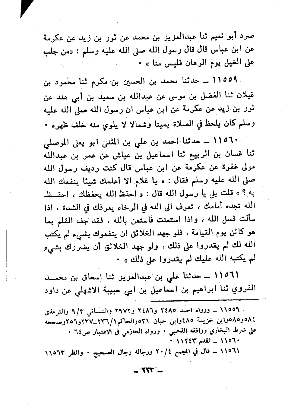 11560 - حَدَّثَنَا أَحْمَدُ بْنُ عَلِيِّ بْنِ الْمُثَنَّى أَبُو يَعْلَى الْمَوْصِلِيُّ، ثنا غَسَّانُ بْنُ الرَّبِيعِ، ثنا إِسْمَاعِيلُ بْنُ عَيَّاشٍ، عَنْ عُمَرَ بْنِ عَبْدِ اللهِ، مَوْلَى غُفْرَةَ، عَنْ عِكْرِمَةَ، عَنِ ابْنِ عَبَّاسٍ، قَالَ: كُنْتُ رَدِيفَ رَسُولِ اللهِ صَلَّى اللهُ عَلَيْهِ وَسَلَّمَ فَقَالَ: «يَا غُلَامُ، أَلَا أُعَلِّمُكَ شَيْئًا يَنْفَعُكَ اللهُ بِهِ؟» قُلْتُ: بَلَى، يَا رَسُولَ اللهِ، فَقَالَ: «§احْفَظِ اللهَ يَحْفَظْكَ، احْفَظِ اللهَ تَجِدْهُ أَمَامَكَ، تَعَرَّفْ إِلَى اللهِ فِي الرَّخَاءِ يَعْرِفْكَ فِي الشِّدَّةِ، إِذَا سَأَلْتَ فَسَلِ اللهَ، وَإِذَا اسْتَعَنْتَ فَاسْتَعِنْ بِاللهِ، فَقَدْ جَفَّ الْقَلَمُ بِمَا هُوَ كَائِنٌ يَوْمَ الْقِيَامَةِ، فَلَوْ جَهَدَ الْخَلَائِقُ أَنْ يَنْفَعُوكَ بِشَيْءٍ لَمْ يَكْتُبْهُ اللهُ لَكَ لَمْ يَقْدِرُوا عَلَى ذَلِكَ، وَلَوْ جَهَدَ الْخَلَائِقُ أَنْ يَضُرُّوكَ بِشَيْءٍ لَمْ يَكْتُبْهُ اللهُ عَلَيْكَ لَمْ يَقْدِرُوا عَلَى ذَلِكَ»
