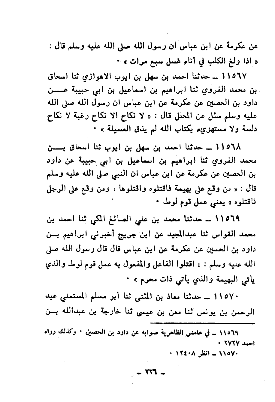 11569 - حَدَّثَنَا مُحَمَّدُ بْنُ عَلِيٍّ الصَّائِغُ الْمَكِّيُّ، ثنا أَحْمَدُ بْنُ مُحَمَّدٍ الْقَوَّاسُ، ثنا عَبْدُ الْمَجِيدِ، عَنِ ابْنِ جُرَيْجٍ، أَخْبَرَنِي إِبْرَاهِيمُ بْنُ دَاوُدَ بْنِ الْحُسَيْنِ، عَنْ عِكْرِمَةَ، عَنِ ابْنِ عَبَّاسٍ، قَالَ: قَالَ رَسُولُ اللهِ صَلَّى اللهُ عَلَيْهِ وَسَلَّمَ: «§اقْتُلُوا الْفَاعِلَ وَالْمَفْعُولَ بِهِ عَمَلَ قَوْمِ لُوطٍ، وَالَّذِي يَأْتِي الْبَهِيمَةَ وَالَّذِي يَأْتِي ذَاتَ مُحْرِمٍ»