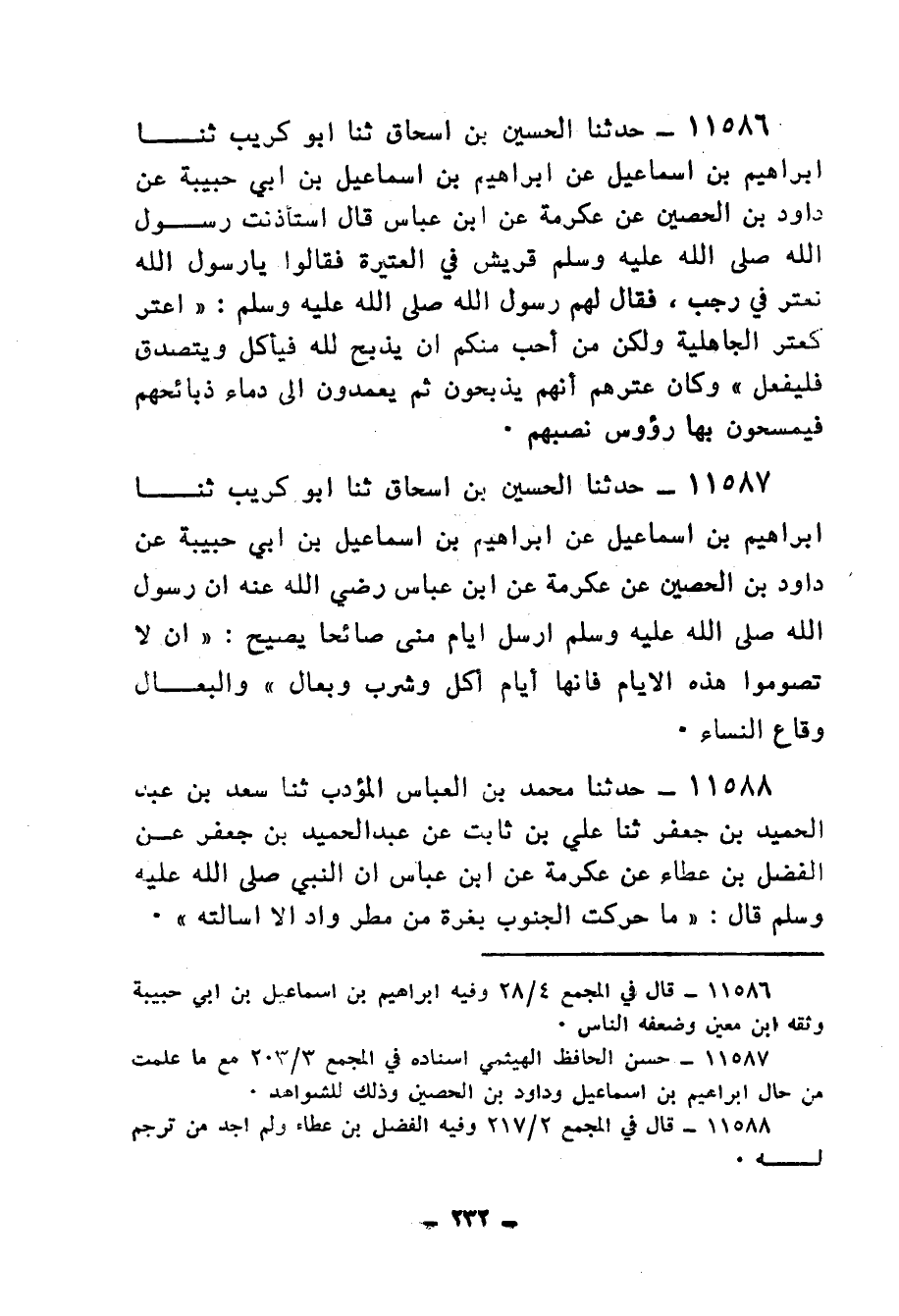 11586 - حَدَّثَنَا الْحُسَيْنُ بْنُ إِسْحَاقَ، ثنا أَبُو كُرَيْبٍ، ثنا إِبْرَاهِيمُ بْنُ إِسْمَاعِيلَ، عَنْ إِبْرَاهِيمَ بْنِ إِسْمَاعِيلَ بْنِ أَبِي حَبِيبَةَ، عَنْ دَاوُدَ بْنِ الْحُصَيْنِ، عَنْ عِكْرِمَةَ، عَنِ ابْنِ عَبَّاسٍ، قَالَ: اسْتَأْذَنَتْ رَسُولَ اللهِ صَلَّى اللهُ عَلَيْهِ وَسَلَّمَ قُرَيْشٌ فِي الْعَتِيرَةِ، فَقَالُوا: يَا رَسُولَ اللهِ نَعْتِرُ فِي رَجَبٍ، فَقَالَ لَهُمْ رَسُولُ اللهِ صَلَّى اللهُ عَلَيْهِ وَسَلَّمَ: «§أَعِتْرٌ كَعِتْرِ الْجَاهِلِيَّةِ، وَلَكِنْ مَنْ أَحَبَّ مِنْكُمْ أَنْ يَذْبَحَ لِلَّهِ فَيَأْكُلَ وَيَتَصَدَّقَ فَلْيَفْعَلْ» ، وَكَانَ عِتْرُهُمْ أَنَّهُمْ يَذْبَحُونَ ثُمَّ يَعْمِدُونَ إِلَى دِمَاءِ ذَبَائِحِهِمْ فَيَمْسَحُونَ بِهَا رُءُوسَ نُصُبِهمْ