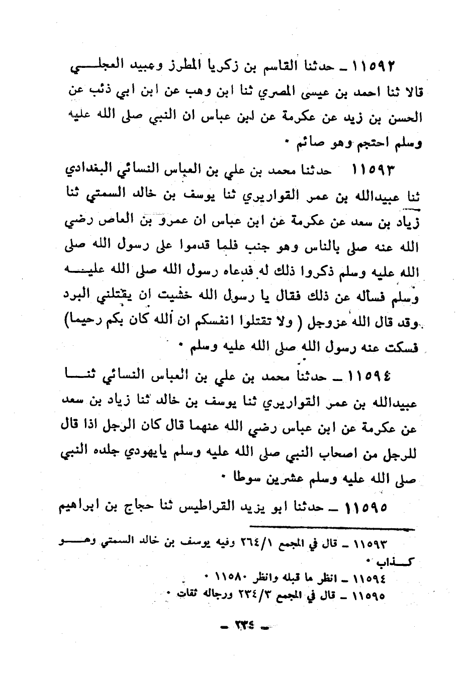 11593 - حَدَّثَنَا مُحَمَّدُ بْنُ عَلِيِّ بْنِ الْعَبَّاسِ النَّسَائِيُّ الْبَغْدَادِيُّ، ثنا عُبَيْدُ اللهِ بْنِ عُمَرَ الْقَوَارِيرِيُّ، ثنا يُوسُفُ بْنُ خَالِدٍ السَّمْتِيُّ، ثنا زِيَادُ بْنُ سَعْدٍ، عَنْ عِكْرِمَةَ، عَنِ ابْنِ عَبَّاسٍ، " أَنَّ عَمْرَو بْنَ الْعَاصِ رَضِي اللهُ عَنْهُ صَلَّى بِالنَّاسِ وَهُوَ جُنُبٌ، فَلَمَّا قَدِمُوا عَلَى رَسُولِ اللهِ صَلَّى اللهُ عَلَيْهِ وَسَلَّمَ ذَكَرُوا ذَلِكَ لَهُ، فَدَعَاهُ رَسُولُ اللهِ صَلَّى اللهُ عَلَيْهِ وَسَلَّمَ فَسَأَلَهُ عَنْ ذَلِكَ فَقَالَ: يَا رَسُولَ اللهِ خَشِيتُ أَنْ يَقْتُلَنِي الْبَرْدُ، وَقَدْ قَالَ اللهُ عَزَّ وَجَلَّ: {§وَلَا تَقْتُلُوا أَنْفُسَكُمْ إِنَّ اللهَ كَانَ بِكُمْ رَحِيمًا} [النساء: 29] فَسَكَتَ عَنْهُ رَسُولُ اللهِ صَلَّى اللهُ عَلَيْهِ وَسَلَّمَ "