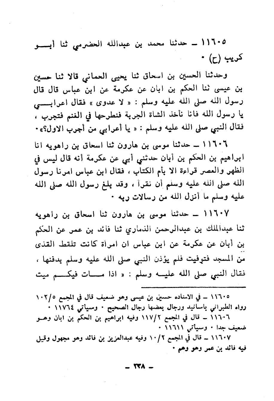 11605 - حَدَّثَنَا مُحَمَّدُ بْنُ عَبْدِ اللهِ الْحَضْرَمِيُّ، ثنا أَبُو كُرَيْبٍ، ح، وَحَدَّثَنَا الْحُسَيْنُ بْنُ إِسْحَاقَ، ثنا يَحْيَى الْحِمَّانِيُّ، قَالَا: ثنا حُسَيْنُ بْنُ عِيسَى، ثنا الْحَكَمُ بْنُ أَبَانَ، عَنْ عِكْرِمَةَ، عَنِ ابْنِ عَبَّاسٍ، قَالَ: قَالَ رَسُولُ اللهِ صَلَّى اللهُ عَلَيْهِ وَسَلَّمَ: «§لَا عَدْوَى» فَقَالَ أَعْرَابِيٌّ: يَا رَسُولَ اللهِ، فَإِنَّا نَأْخُذُ الشَّاةَ الْجَرِبَةَ فَنَطْرَحُهَا فِي الْغَنَمِ فَتَجْرَبُ، فَقَالَ النَّبِيُّ صَلَّى اللهُ عَلَيْهِ وَسَلَّمَ: «يَا أَعْرَابِيُّ منْ أَجْرَبَ الْأَوَّلَ»