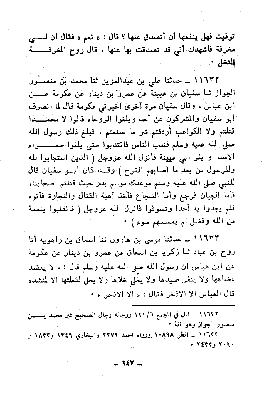 11633 - حَدَّثَنَا مُوسَى بْنُ هَارُونَ، ثنا إِسْحَاقُ بْنُ رَاهَوَيْهِ، أَنَا رَوْحُ بْنُ عُبَادَةَ، ثنا زَكَرِيَّا بْنُ إِسْحَاقَ، عَنْ عَمْرِو بْنِ دِينَارٍ، عَنْ عِكْرِمَةَ، عَنِ ابْنِ عَبَّاسٍ، أَنَّ رَسُولَ اللهِ صَلَّى اللهُ عَلَيْهِ وَسَلَّمَ قَالَ: «§لَا يُعْضَدُ عِضَاهُهَا، وَلَا يُنَفَّرُ صَيْدُهَا، وَلَا يُخَلَّى خَلَاهَا، وَلَا يَحِلُّ لُقَطَتُهَا إِلَّا لِمُنْشِدٍ» قَالَ الْعَبَّاسُ: إِلَّا الْإِذْخِرَ فَقَالَ: «إِلَّا الْإِذْخِرَ»