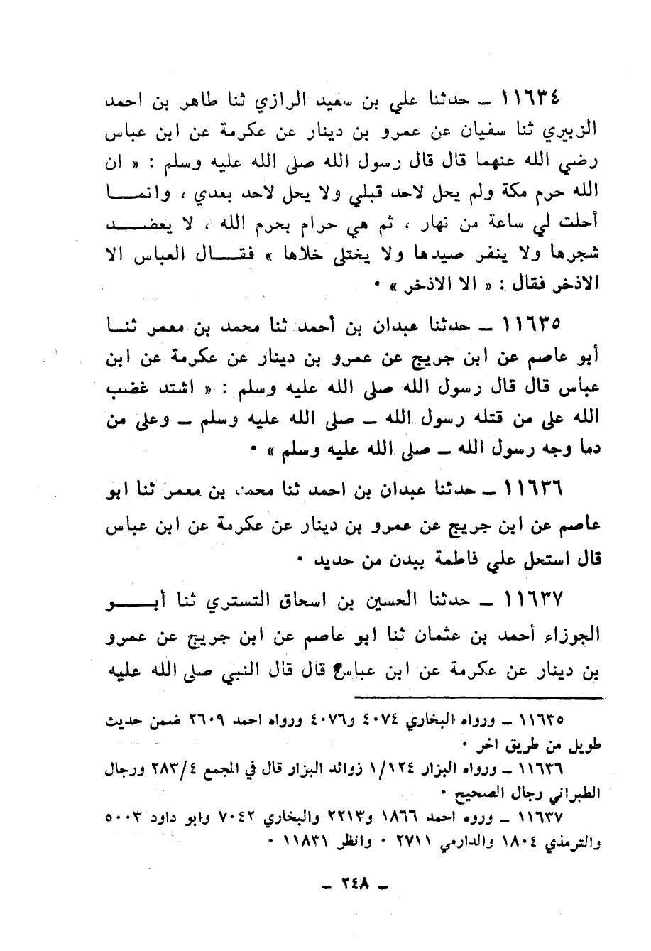 11634 - حَدَّثَنَا عَلِيُّ بْنُ سَعِيدٍ الرَّازِيُّ، ثنا طَاهِرُ بْنُ أَحْمَدَ الزُّبَيْدِيُّ، ثنا سُفْيَانُ، عَنْ عَمْرِو بْنِ دِينَارٍ، عَنْ عِكْرِمَةَ، عَنِ ابْنِ عَبَّاسٍ رَضِي اللهُ عَنْهُمَا، قَالَ: قَالَ رَسُولُ اللهِ صَلَّى اللهُ عَلَيْهِ وَسَلَّمَ: «إِنَّ §اللهَ حَرَّمَ مَكَّةَ، وَلَمْ يَحِلَّ لِأَحَدٍ قَبْلِي، وَلَا يَحِلُّ لِأَحَدٍ بَعْدِي، وَإِنَّمَا أُحِلَّتْ لِي سَاعَةً مِنْ نَهَارٍ، ثُمَّ هِيَ حَرَامٌ بحرمِ اللهِ لَا يُعْضَدُ شَجَرُهَا، وَلَا يُنَفَّرُ صَيْدُهَا، وَلَا يُخْتَلَى خَلَاهَا» فَقَالَ الْعَبَّاسُ: إِلَّا الْإِذْخِرَ، فَقَالَ: «إِلَّا الْإِذْخِرَ»