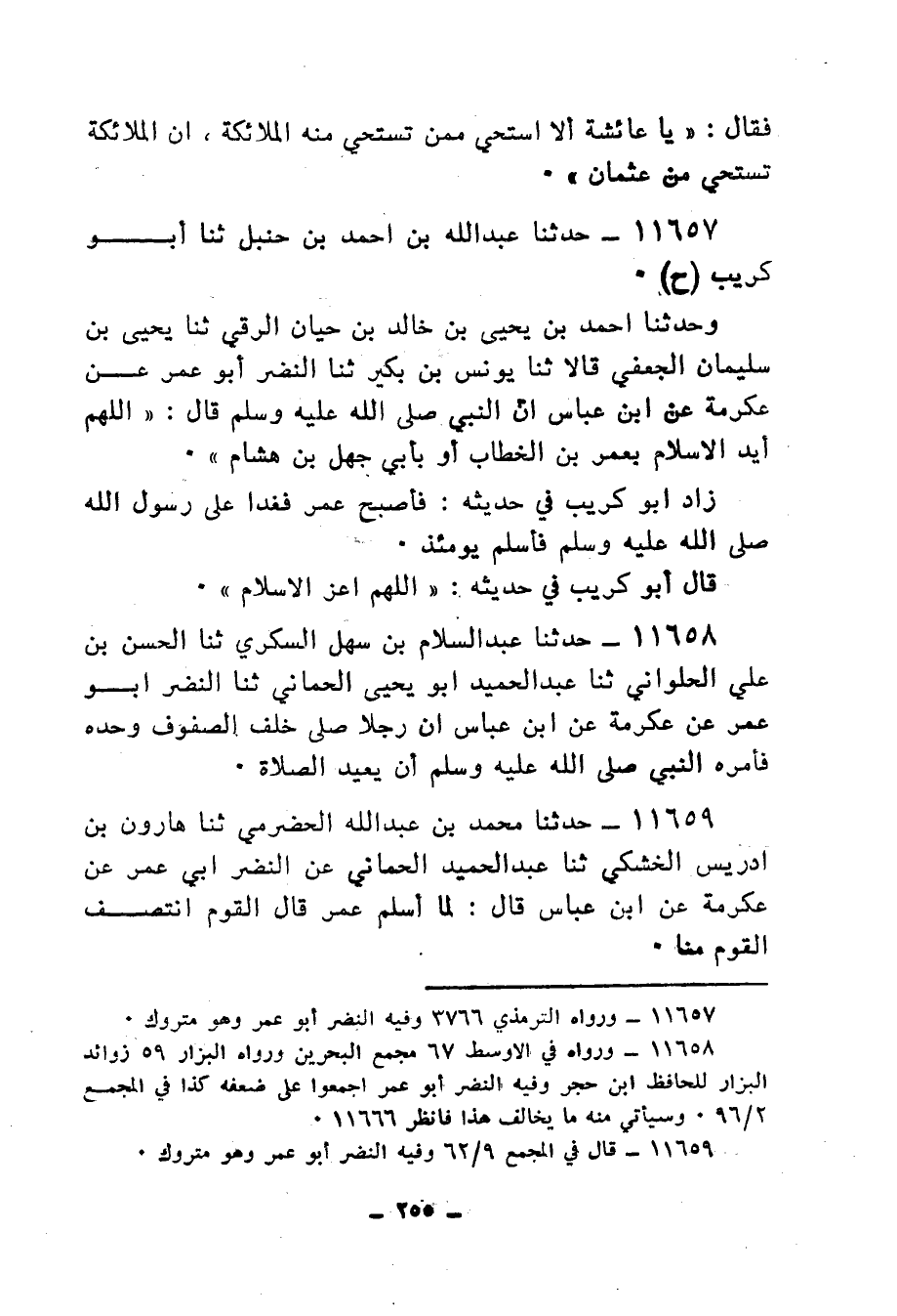 11657 - حَدَّثَنَا عَبْدُ اللهِ بْنُ أَحْمَدَ بْنِ حَنْبَلٍ، ثنا أَبُو كُرَيْبٍ، ح، وَحَدَّثَنَا أَحْمَدُ بْنُ يَحْيَى بْنِ خَالِدِ بْنِ حَيَّانَ الرَّقِّيُّ، ثنا يَحْيَى بْنُ سُلَيْمَانَ الْجُعْفِيُّ، قَالَا: ثنا يُونُسُ بْنُ بُكَيْرٍ، ثنا النَّضْرُ أَبُو عُمَرَ، عَنْ عِكْرِمَةَ، عَنِ ابْنِ عَبَّاسٍ، أَنَّ النَّبِيَّ صَلَّى اللهُ عَلَيْهِ وَسَلَّمَ قَالَ: «§اللهُمَّ أَيِّدِ الْإِسْلَامَ بِعُمَرَ بْنِ الْخَطَّابِ أَوْ بِأَبِي جَهْلِ بْنِ هِشَامٍ» زَادَ أَبُو كُرَيْبٍ فِي حَدِيثِهِ: فَأَصْبَحَ عُمَرُ فَغَدَا عَلَى رَسُولِ اللهِ صَلَّى اللهُ عَلَيْهِ وَسَلَّمَ فَأَسْلَمَ يَوْمَئِذٍ. قَالَ أَبُو كُرَيْبٍ فِي حَدِيثِهِ: «اللهُمَّ أَعَزَّ الْإِسْلَامَ»