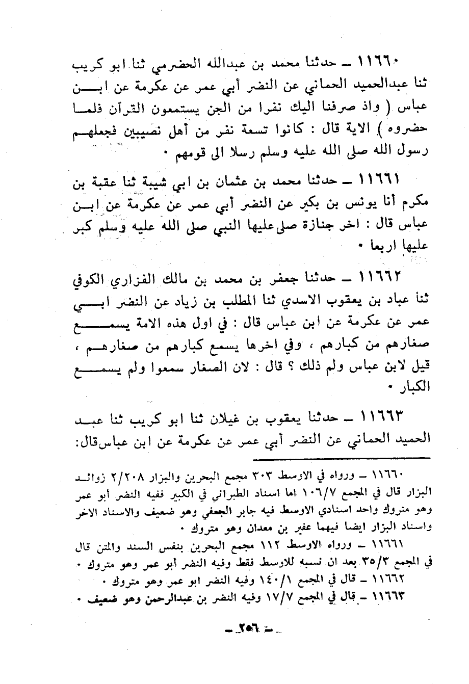11660 - حَدَّثَنَا مُحَمَّدُ بْنُ عَبْدِ اللهِ الْحَضْرَمِيُّ، ثنا أَبُو كُرَيْبٍ، ثنا عَبْدُ الْحَمِيدِ الْحِمَّانِيُّ، عَنِ النَّضْرِ أَبِي عُمَرَ، عَنْ عِكْرِمَةَ، عَنِ ابْنِ عَبَّاسٍ، {وَإِذْ صَرَفْنَا إِلَيْكَ نَفَرًا مِنَ الْجِنِّ يَسْتَمِعُونَ الْقُرْآنَ فَلَمَّا حَضَرُوهُ} [الأحقاف: 29] الْآيَةَ قَالَ: «كَانُوا تِسْعَةَ نَفَرٍ مِنْ أَهْلِ نَصِيبِينَ» §فَجَعَلَهُمْ رَسُولُ اللهِ صَلَّى اللهُ عَلَيْهِ وَسَلَّمَ رُسُلًا إِلَى قَوْمِهِمْ "