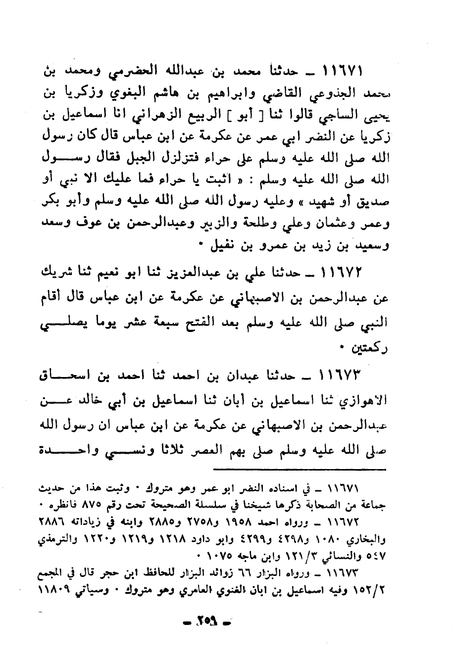 11671 - حَدَّثَنَا مُحَمَّدُ بْنُ عَبْدِ اللهِ الْحَضْرَمِيُّ، وَمُحَمَّدُ بْنُ مُحَمَّدٍ الْجذوعيُّ الْقَاضِي، وَإِبْرَاهِيمُ بْنُ هَاشِمٍ الْبَغَوِيُّ، وَزَكَرِيَّا بْنُ يَحْيَى السَّاجِيُّ، قَالُوا: ثنا أَبُو الرَّبِيعِ الزَّهْرَانِيُّ، أَنَا إِسْمَاعِيلُ بْنُ زَكَرِيَّا، عَنِ النَّضْرِ أَبِي عُمَرَ، عَنْ عِكْرِمَةَ، عَنِ ابْنِ عَبَّاسٍ، قَالَ: كَانَ رَسُولُ اللهِ صَلَّى اللهُ عَلَيْهِ وَسَلَّمَ عَلَى حِرَاءَ، فَتَزَلْزَلَ الْجَبَلُ، فَقَالَ رَسُولُ اللهِ صَلَّى اللهُ عَلَيْهِ وَسَلَّمَ: «§اثْبُتْ يَا حِرَاءُ فَمَا عَلَيْكَ إِلَّا نَبِيٌّ أَوْ صِدِّيقٌ أَوْ شَهِيدٌ» . وَعَلَيْهِ رَسُولُ اللهِ صَلَّى اللهُ عَلَيْهِ وَسَلَّمَ وَأَبُو بَكْرٍ وَعُمَرُ وَعُثْمَانُ وَعَلِيٌّ وَطَلْحَةُ وَالزُّبَيْرُ وَعَبْدُ الرَّحْمَنِ بْنُ عَوْفٍ وَسَعْدٌ وَسَعِيدُ بْنُ زَيْدِ بْنِ عَمْرِو بْنِ نُفَيْلٍ