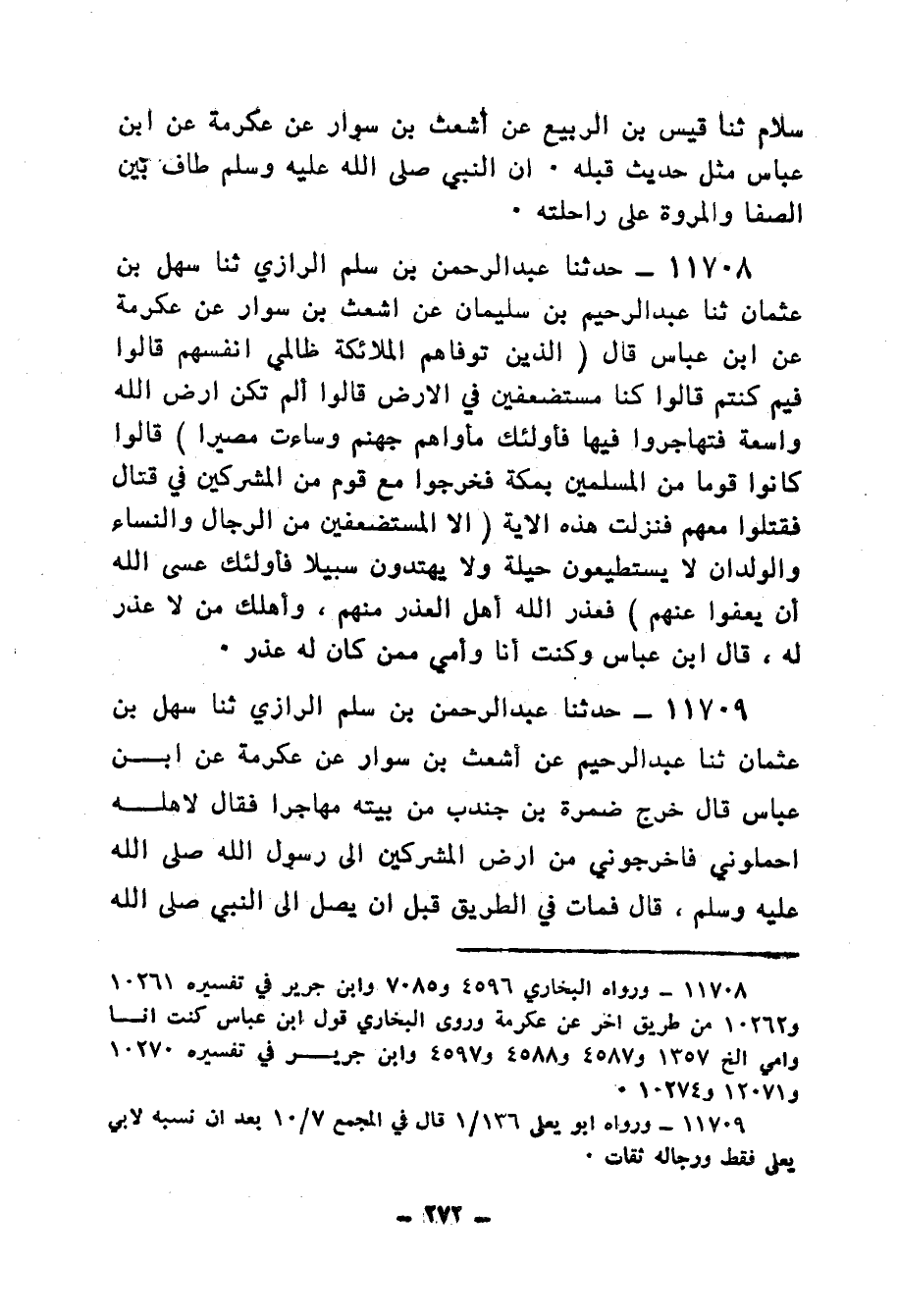 11708 - حَدَّثَنَا عَبْدُ الرَّحْمَنِ بْنُ سَلْمٍ الرَّازِيُّ، ثنا سَهْلُ بْنُ عُثْمَانَ، ثنا عَبْدُ الرَّحِيمِ بْنُ سُلَيْمَانَ، عَنْ أَشْعَثَ بْنِ سَوَّارٍ، عَنْ عِكْرِمَةَ، عَنِ ابْنِ عَبَّاسٍ، قَالَ: {الَّذِينَ تَوَفَّاهُمُ الْمَلَائِكَةُ ظَالِمِي أَنْفُسِهِمْ قَالُوا فِيمَ كُنْتُمْ قَالُوا كُنَّا مُسْتَضْعَفِينَ فِي الْأَرْضِ قَالُوا أَلَمْ تَكُنْ أَرْضُ اللهِ وَاسِعَةً فَتُهَاجِرُوا فِيهَا فَأُولَئِكَ مأواهمْ جَهَنَّمُ وَسَاءَتْ مَصِيرًا} [النساء: 97] قَالُوا: كَانُوا قَوْمًا مِنَ الْمُسْلِمِينَ بِمَكَّةَ فَخَرَجُوا مَعَ قَوْمٍ مِنَ الْمُشْرِكِينَ فِي قِتَالٍ فَقُتِلُوا مَعَهُمْ فَنَزَلَتْ هَذِهِ الْآيَةُ {إِلَّا الْمُسْتَضْعَفِينَ مِنَ الرِّجَالِ وَالنِّسَاءِ وَالْوِلْدَانِ لَا يَسْتَطِيعُونَ حِيلَةً وَلَا يَهْتَدُونَ سَبِيلًا فَأُولَئِكَ عَسَى اللهُ أَنْ يَعْفُوَ عَنْهُمْ} [النساء: 99] فَعَذَرَ اللهُ أَهْلَ الْعُذْرِ مِنْهُمْ، وَأَهْلَكَ مَنْ لَا عُذْرَ لَهُ قَالَ ابْنُ عَبَّاسٍ: «§وكُنتُ أَنَا وَأُمِّي مِمَّنْ كَانَ لَهُ عُذْرٌ»