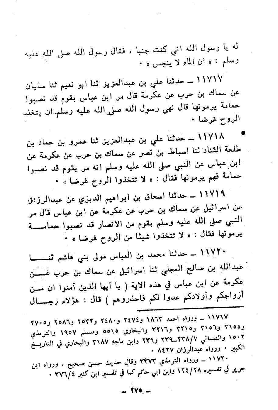 11718 - حَدَّثَنَا عَلِيُّ بْنُ عَبْدِ الْعَزِيزِ، ثنا عَمْرُو بْنُ حَمَّادِ بْنِ طَلْحَةَ الْقَنَّادُ، ثنا أَسْبَاطُ بْنُ نَصْرٍ، عَنْ سِمَاكِ بْنِ حَرْبٍ، عَنْ عِكْرِمَةَ، عَنِ ابْنِ عَبَّاسٍ، عَنِ النَّبِيِّ صَلَّى اللهُ عَلَيْهِ وَسَلَّمَ، أَنَّهُ مَرَّ بِقَوْمٍ قَدْ نَصَبُوا حَمَامَةً فَهُمْ يَرْمُونَهَا، فَقَالَ: «§لَا تَتَّخِذُوا الرُّوحَ غَرَضًا»