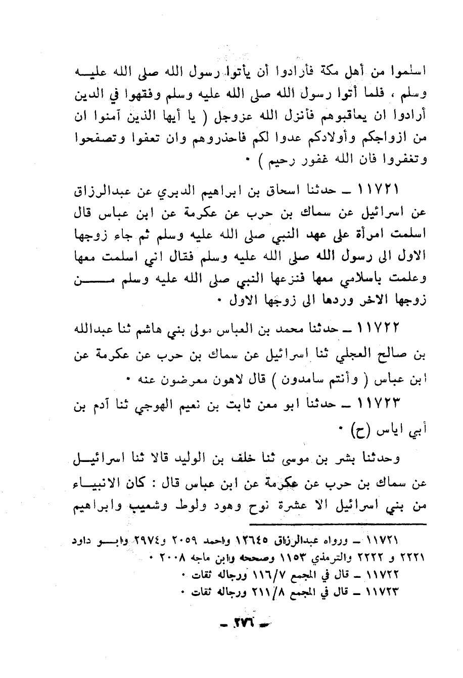 11721 - حَدَّثَنَا إِسْحَاقُ بْنُ إِبْرَاهِيمَ الدَّبَرِيُّ، عَنْ عَبْدِ الرَّزَّاقِ، عَنْ إِسْرَائِيلَ، عَنْ سِمَاكِ بْنِ حَرْبٍ، عَنْ عِكْرِمَةَ، عَنِ ابْنِ عَبَّاسٍ، قَالَ: أَسْلَمْتِ امْرَأَةٌ عَلَى عَهْدِ النَّبِيِّ صَلَّى اللهُ عَلَيْهِ وَسَلَّمَ، ثُمَّ جَاءَ زَوْجُهَا الْأَوَّلُ إِلَى رَسُولِ اللهِ صَلَّى اللهُ عَلَيْهِ وَسَلَّمَ فَقَالَ: إِنِّي أَسْلَمْتُ مَعَهَا وَعَلِمَتْ بِإِسْلَامِي مَعَهَا، «§فَنَزَعَهَا النَّبِيُّ صَلَّى اللهُ عَلَيْهِ وَسَلَّمَ مِنْ زَوْجِهَا الْآخِرِ، وَرَدَّهَا إِلَى زَوْجِهَا الْأَوَّلِ»