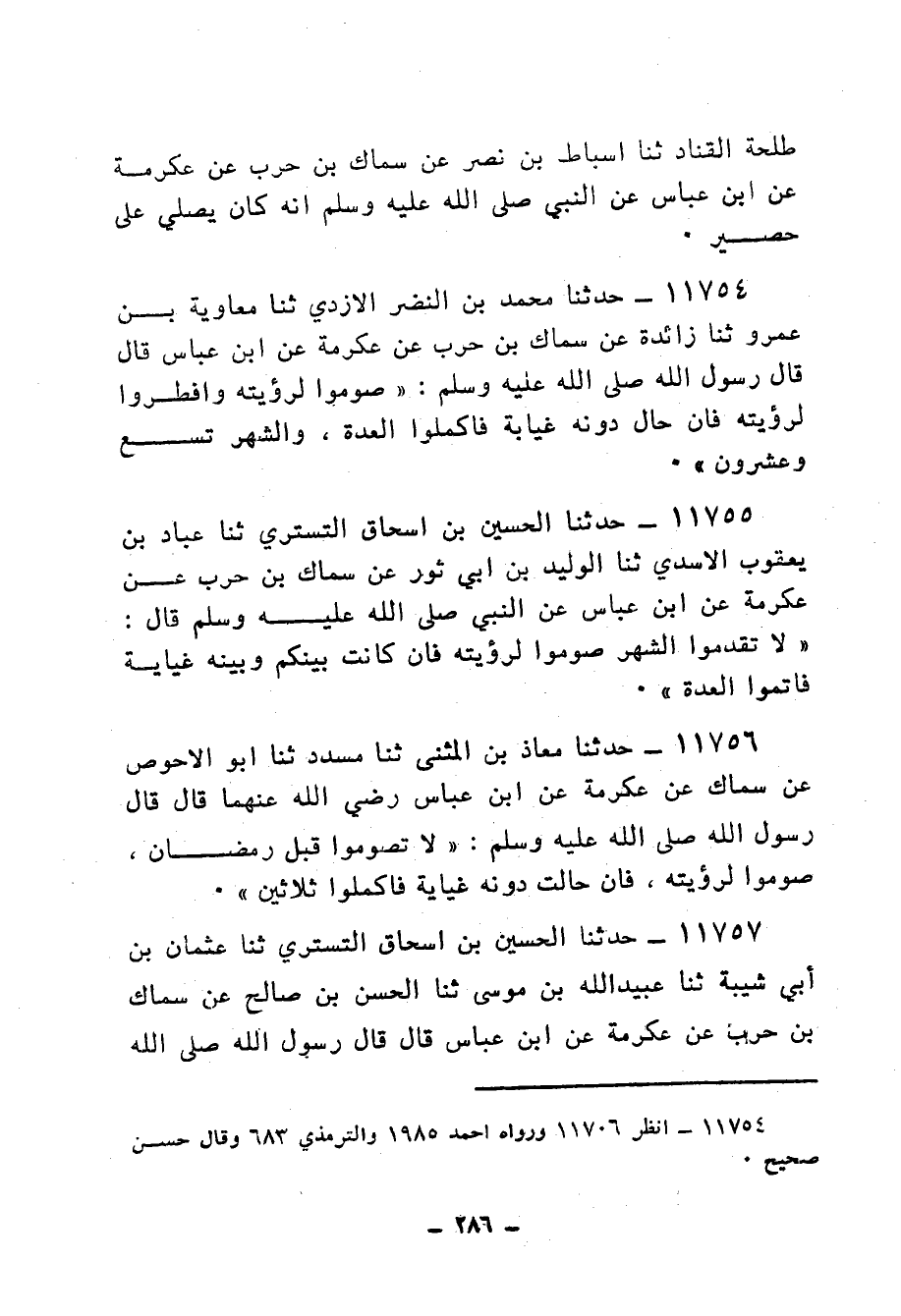 11754 - حَدَّثَنَا مُحَمَّدُ بْنُ النَّضْرِ الْأَزْدِيُّ، ثنا مُعَاوِيَةُ بْنُ عَمْرٍو، ثنا زَائِدَةُ، عَنْ سِمَاكِ بْنِ حَرْبٍ، عَنْ عِكْرِمَةَ، عَنِ ابْنِ عَبَّاسٍ، قَالَ: قَالَ رَسُولُ اللهِ صَلَّى اللهُ عَلَيْهِ وَسَلَّمَ: «§صُومُوا لِرُؤْيَتِهِ وَأَفْطِرُوا لِرُؤْيَتِهِ، فَإِنْ حَالَ دُونَهُ غَيَايَةٌ، فَأَكْمِلُوا الْعِدَّةَ، وَالشَّهْرُ تِسْعٌ وَعِشْرُونَ»