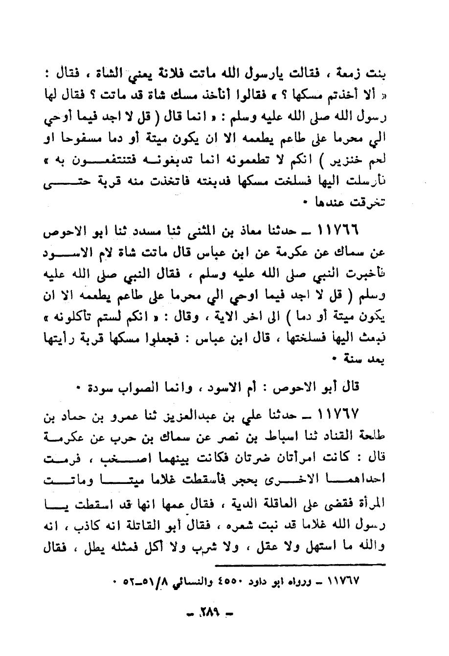 11766 - حَدَّثَنَا مُعَاذُ بْنُ الْمُثَنَّى، ثنا مُسَدَّدٌ، ثنا أَبُو الْأَحْوَصِ، عَنْ سِمَاكٍ، عَنْ عِكْرِمَةَ، عَنِ ابْنِ عَبَّاسٍ، قَالَ: مَاتَتْ شَاةٌ لِأُمِّ الْأَسْوَدِ فَأَخْبَرَتِ النَّبِيَّ صَلَّى اللهُ عَلَيْهِ وَسَلَّمَ، فَقَالَ النَّبِيُّ صَلَّى اللهُ عَلَيْهِ وَسَلَّمَ: {قُلْ لَا أَجِدُ فِيمَا أُوحِيَ إِلَيَّ مُحَرَّمًا عَلَى طَاعِمٍ يَطْعَمُهُ إِلَّا أَنْ يَكُونَ مَيْتَةً أَوْ دَمًا} إِلَى آخِرِ الْآيَةِ وَقَالَ: «§إِنَّكُمْ لَسْتُمْ تَأْكُلُونَهُ فَبَعَثَتْ إِلَيْهَا فَسَلَخَتْها» . قَالَ ابْنُ عَبَّاسٍ: فَجَعَلُوا مَسْكَهَا قِرْبَةً رَأَيْتُهَا بَعْدَ سَنَةٍ. قَالَ أَبُو الْأَحْوَصِ: أُمُّ ألاسودِ، وَإِنَّمَا الصَّوَابُ سَوْدَةُ