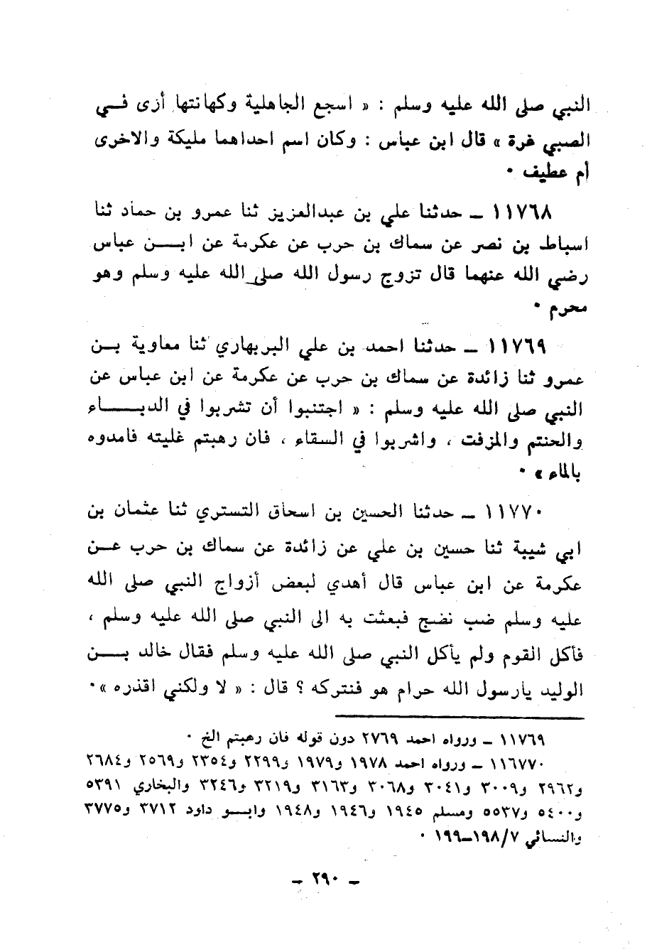 11770 - حَدَّثَنَا الْحُسَيْنُ بْنُ إِسْحَاقَ التُّسْتَرِيُّ، ثنا عُثْمَانُ بْنُ أَبِي شَيْبَةَ، ثنا حُسَيْنُ بْنُ عَلِيٍّ، عَنْ زَائِدَةَ، عَنْ سِمَاكِ بْنِ حَرْبٍ، عَنْ عِكْرِمَةَ، عَنِ ابْنِ عَبَّاسٍ، قَالَ: أُهْدِيَ لِبَعْضِ أَزْوَاجِ النَّبِيِّ صَلَّى اللهُ عَلَيْهِ وَسَلَّمَ ضَبٌّ نَضِجٌ فَبَعَثَتْ بِهِ إِلَى النَّبِيِّ صَلَّى اللهُ عَلَيْهِ وَسَلَّمَ فَأَكَلَ الْقَوْمُ، وَلَمْ يَأْكُلِ النَّبِيُّ صَلَّى اللهُ عَلَيْهِ وَسَلَّمَ فَقَالَ خَالِدُ بْنُ الْوَلِيدِ: يَا رَسُولَ اللهِ حَرَامٌ هُوَ فَنَتْرُكُهُ؟ قَالَ: «لَا، §وَلَكِنِّي أَقْذُرُهُ»