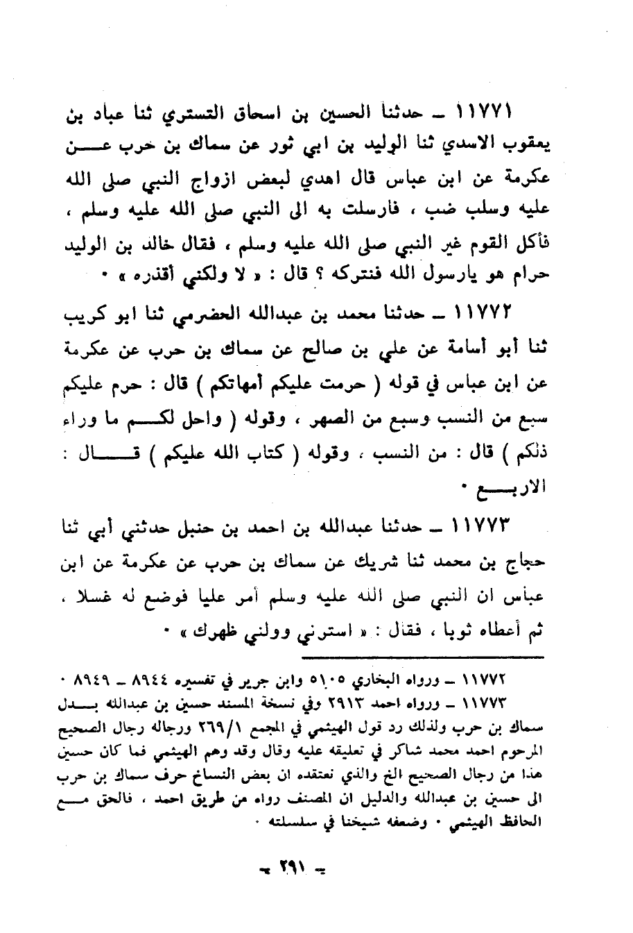11771 - حَدَّثَنَا الْحُسَيْنُ بْنُ إِسْحَاقَ التُّسْتَرِيُّ، ثنا عَبَّادُ بْنُ يَعْقُوبَ الْأَسَدِيُّ، ثنا الْوَلِيدُ بْنُ أَبِي ثَوْرٍ، عَنْ سِمَاكِ بْنِ حَرْبٍ، عَنْ عِكْرِمَةَ، عَنِ ابْنِ عَبَّاسٍ، قَالَ: أُهْدِيَ لِبَعْضِ أَزْوَاجِ النَّبِيِّ صَلَّى اللهُ عَلَيْهِ وَسَلَّمَ ضَبٌّ، فَأَرْسَلَتْ بِهِ إِلَى النَّبِيِّ صَلَّى اللهُ عَلَيْهِ وَسَلَّمَ، فَأَكَلَ الْقَوْمُ غَيْرُ النَّبِيِّ صَلَّى اللهُ عَلَيْهِ وَسَلَّمَ، فَقَالَ خَالِدُ بْنُ الْوَلِيدِ حَرَامٌ هُوَ يَا رَسُولَ اللهِ فَنَتْرُكُهُ؟ قَالَ: «لَا، §وَلَكِنِّي أَقْذُرُهُ»