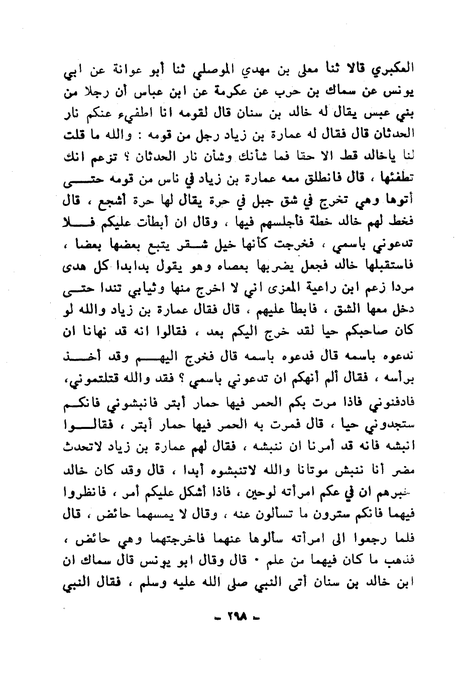 11793 - حَدَّثَنَا عَلِيُّ بْنُ عَبْدِ الْعَزِيزِ، وَخَلَفُ بْنُ عَمْرٍو الْعُكْبَرِيُّ، قَالَا: ثنا مُعَلَّى بْنُ مَهْدِيٍّ الْمَوْصِلِيُّ، ثنا أَبُو عَوَانَةَ، عَنْ أَبِي يُونُسَ، عَنْ سِمَاكِ بْنِ حَرْبٍ، عَنْ عِكْرِمَةَ، عَنِ ابْنِ عَبَّاسٍ، أَنَّ رَجُلًا مِنْ بَنِي عَبْسٍ يُقَالُ لَهُ: خَالِدُ بْنُ سِنَانَ قَالَ لِقَوْمِهِ: أَنَا أُطْفِئُ عَنْكُمْ نَارَ الْحَدَثَانِ، قَالَ: فَقَالَ لَهُ عُمَارَةُ بْنُ زِيَادٍ رَجُلٌ مِنْ قَوْمِهِ: وَاللهِ مَا قُلْتُ لَنَا يَا خَالِدُ قَطُّ إِلَّا حَقًّا فَمَا شَأْنُكَ وشأنُ نَارِ الْحَدَثَانِ؟، تَزْعُمُ أَنَّكَ تُطْفِئُها، قَالَ: فَانْطَلَقَ مَعَهُ عُمَارَةُ بْنُ زِيَادٍ فِي نَاسٍ مِنْ قَوْمِهِ حَتَّى أَتَوْها وَهِيَ تَخْرُجُ فِي شَقِّ جَبَلٍ فِي حَرَّةٍ يُقَالُ لَهَا: حَرَّةُ أَشْجَعَ، قَالَ: فَخَطَّ لَهُمْ خَالِدٌ خَطَّةً فَأَجْلَسَهُمْ فِيهَا، وَقَالَ: إِنْ أَبْطَأْتُ عَلَيْكُمْ فَلَا تَدْعُونِي بِاسْمِي، فَخَرَجَتْ كَأَنَّهَا خَيْلٌ شُقْرٌ يَتْبَعُ بَعْضُهَا بَعْضًا، فَاسْتَقْبَلَهَا خَالِدٌ فَجَعَلَ يَضْرِبُهَا بِعَصَاهُ وَهُوَ يَقُولُ: بَدَا بَدَا كُلٌّ هُدى مُرْدًا، زَعَمَ ابْنُ رَاعِيَةِ الْمَعْزَى أَنِّي لَا أَخْرُجُ مِنْهَا وَثِيَابِي تَنْدَى حَتَّى دَخَلَ مَعَهَا الشِّقَّ، فَأَبْطَأَ عَلَيْهِمْ، قَالَ: فَقَالَ عُمَارَةُ بْنُ زِيَادٍ: وَاللهِ لَوْ كَانَ صَاحِبُكُمْ حَيًّا لَقَدْ خَرَجَ إِلَيْكُمْ بَعْدُ، فَقَالُوا: إِنَّهُ قَدْ نَهَانَا أَنْ نَدْعُوَهُ بِاسْمِهِ قَالَ: فَدَعُوهُ بِاسْمِهِ قَالَ: فَخَرَجَ إِلَيْهِمْ وَقَدْ أَخَذَ بِرَأْسِهِ، فَقَالَ: أَلَمْ أَنْهَكُمْ أَنْ تَدْعُونِي بِاسْمِي؟ فَقَدْ وَاللهِ قَتَلْتُمُوني، فَادْفِنُونِي فَإِذَا مَرَّتْ بِكُمُ الْحُمُرُ فِيهَا حِمَارٌ أَبْتَرُ فانْبُشُوني فَإِنَّكُمْ سَتَجِدُوني حَيًّا، قَالَ: فَمَرَّتْ بِهِ الْحُمُرُ فِيهَا حِمَارٌ أَبْتَرُ، فَقَالُوا: انْبُشْهُ فَإِنَّهُ قَدْ أَمَرَنَا أَنْ نَنْبُشَهُ، فَقَالَ لَهُمْ عُمَارَةُ بْنُ زِيَادٍ: لَا تُحَدِّثُ مُضَرُ أَنَّا نَنْبُشُ مَوْتَانَا وَاللهِ لَا تَنْبُشُوهُ أَبَدًا، قَالَ: وَقَدْ كَانَ خَالِدٌ أَخْبَرَهُمْ أَنَّ فِي عِكْمِ امْرَأَتِهِ لَوْحَيْنِ، فَإِذَا أَشْكَلَ عَلَيْكُمْ أَمْرٌ فَانْظُرُوا فِيهِمَا، فَإِنَّكُمْ سَتَرَوْنَ مَا تَسْأَلُونَ عَنْهُ، وَقَالَ: لَا يَمَسَّهُما حَائِضٌ قَالَ: فَلَمَّا رَجَعُوا إِلَى امْرَأَتِهِ سَأَلُوها عَنْهُمَا، فَأَخْرَجَتْهُما وَهِيَ حَائِضٌ، فَذَهَبَ مَا كَانَ فِيهِمَا مِنْ عَلِمٍ، قَالَ: وَقَالَ أَبُو يُونُسَ: قَالَ سِمَاكٌ: إِنَّ ابْنَ خَالِدِ بْنِ سِنَانَ أَتَى النَّبِيَّ صَلَّى اللهُ عَلَيْهِ وَسَلَّمَ فَقَالَ النَّبِيُّ صَلَّى اللهُ عَلَيْهِ وَسَلَّمَ: «§مَرْحَبًا بِابْنِ أَخِي، وَأَبُو يُونُسَ حَاتِمُ بْنُ أَبِي صَغِيرَةَ»