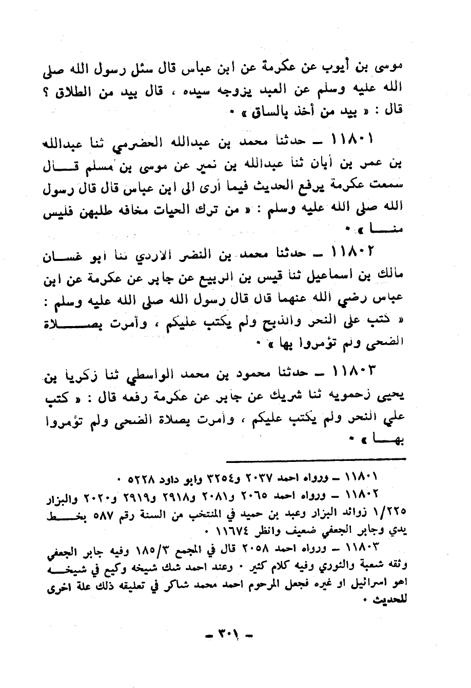 11801 - حَدَّثَنَا مُحَمَّدُ بْنُ عَبْدِ اللهِ الْحَضْرَمِيُّ، ثنا عَبْدُ اللهِ بْنُ عُمَرَ بْنِ أَبَانَ، ثنا عَبْدُ اللهِ بْنُ نُمَيْرٍ، عَنْ مُوسَى بْنِ مُسْلِمٍ، قَالَ: سَمِعْتُ عِكْرِمَةَ، يَرْفَعُ الْحَدِيثَ فِيمَا أَرَى إِلَى ابْنِ عَبَّاسٍ، قَالَ: قَالَ رَسُولُ اللهِ صَلَّى اللهُ عَلَيْهِ وَسَلَّمَ: «§مَنْ تَرَكَ الْحَيَّاتِ مَخَافَةَ طَلَبِهِنَّ فَلَيْسَ مِنَّا»