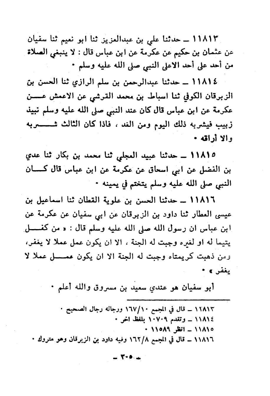 11813 - حَدَّثَنَا عَلِيُّ بْنُ عَبْدِ الْعَزِيزِ، ثنا أَبُو نُعَيْمٍ، ثنا سُفْيَانُ، عَنْ عُثْمَانَ بْنِ حَكِيمٍ، عَنْ عِكْرِمَةَ، عَنِ ابْنِ عَبَّاسٍ، قَالَ: «§لَا يَنْبَغِي الصَّلَاةُ مِنْ أَحَدٍ عَلَى أَحَدٍ، إِلَّا عَلَى النَّبِيِّ صَلَّى اللهُ عَلَيْهِ وَسَلَّمَ»
