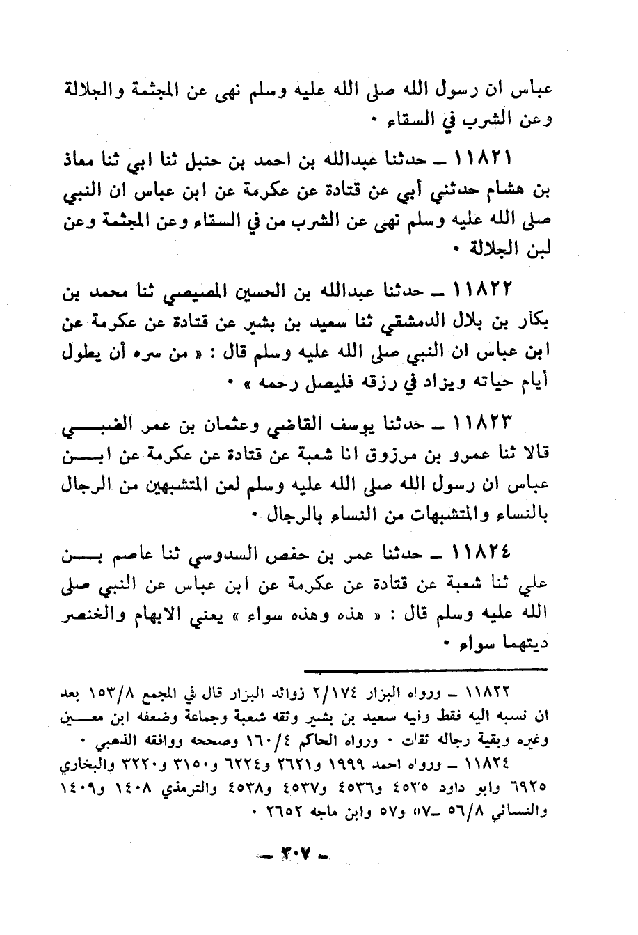 11821 - حَدَّثَنَا عَبْدُ اللهِ بْنُ أَحْمَدَ بْنِ حَنْبَلٍ، ثنا أَبِي، ثنا مُعَاذُ بْنُ هِشَامٍ، حَدَّثَنِي أَبِي، عَنْ قَتَادَةَ، عَنْ عِكْرِمَةَ، عَنِ ابْنِ عَبَّاسٍ، أَنَّ النَّبِيَّ صَلَّى اللهُ عَلَيْهِ وَسَلَّمَ: «§نَهَى عَنِ الشُّرْبِ مِنْ فِي السِّقَاءِ، وَعَنِ الْمُجَثَّمَةِ، وَعَنْ لَبَنِ الْجَلَّالَةِ»
