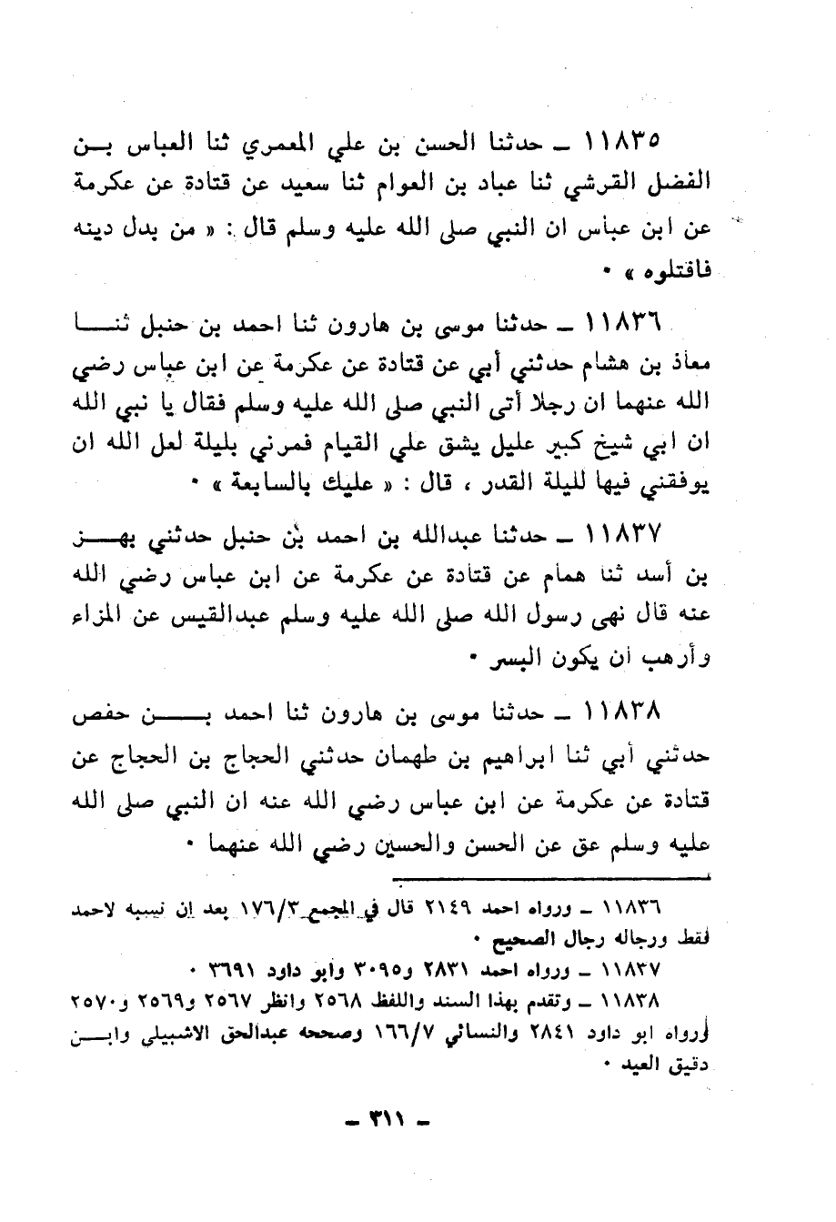 11835 - حَدَّثَنَا الْحَسَنُ بْنُ عَلِيٍّ الْمَعْمَرِيُّ، ثنا الْعَبَّاسُ بْنُ الْفَضْلِ الْقُرَشِيُّ، ثنا عَبَّادُ بْنُ الْعَوَّامِ، ثنا سَعِيدٌ، عَنْ قَتَادَةَ، عَنْ عِكْرِمَةَ، عَنِ ابْنِ عَبَّاسٍ، أَنَّ النَّبِيَّ صَلَّى اللهُ عَلَيْهِ وَسَلَّمَ قَالَ: «§مَنْ بَدَّلَ دِينَهُ فَاقْتُلُوهُ»