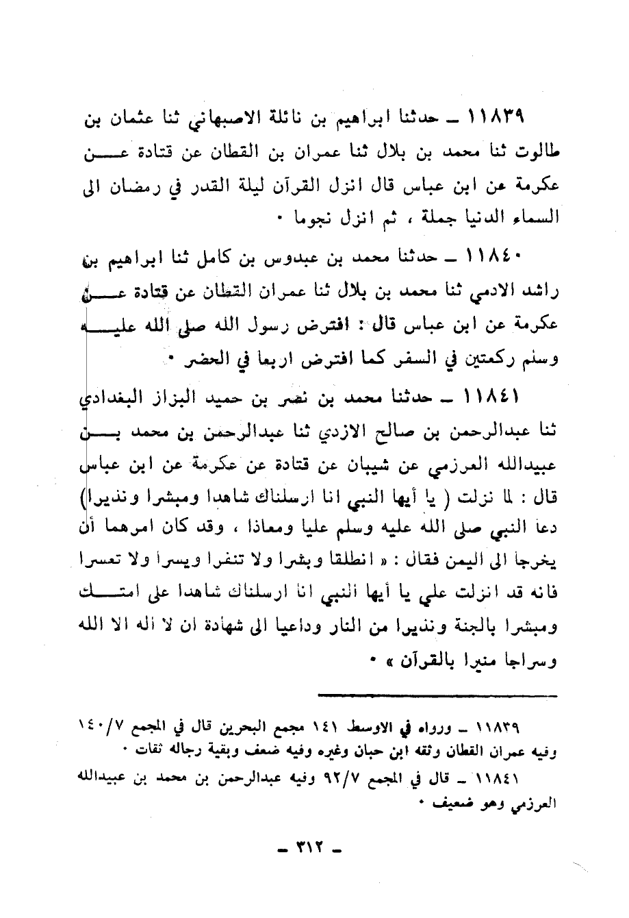 11839 - حَدَّثَنَا إِبْرَاهِيمُ بْنُ نَائِلَةَ الْأَصْبَهَانِيُّ، ثنا عُثْمَانُ بْنُ طَالُوتَ، ثنا مُحَمَّدُ بْنُ بِلَالٍ، ثنا عِمْرَانُ بْنُ الْقَطَّانِ، عَنْ قَتَادَةَ، عَنْ عِكْرِمَةَ، عَنِ ابْنِ عَبَّاسٍ، قَالَ: «§أُنْزِلَ الْقُرْآنُ لَيْلَةَ الْقَدْرِ فِي رَمَضَانَ إِلَى السَّمَاءِ الدُّنْيَا جُمْلَةً، ثُمَّ أُنْزِلَ نُجُومًا»