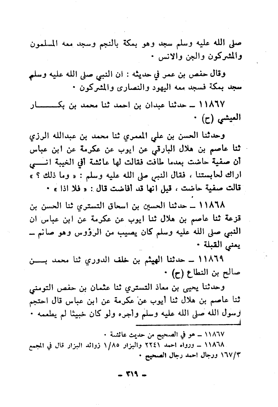 11867 - حَدَّثَنَا عَبْدَانُ بْنُ أَحْمَدَ، ثنا مُحَمَّدُ بْنُ بَكَّارٍ الْعَيْشِيُّ، ح، وَحَدَّثَنَا الْحَسَنُ بْنُ عَلِيٍّ الْمَعْمَرِيُّ، ثنا مُحَمَّدُ بْنُ عَبْدِ اللهِ الرُّزِّيُّ، ثنا عَاصِمُ بْنُ هِلَالٍ الْبَارِقِيُّ، عَنْ أَيُّوبَ، عَنْ عِكْرِمَةَ، عَنِ ابْنِ عَبَّاسٍ، أَنَّ صَفِيَّةَ حَاضَتْ بَعْدَمَا طَافَتْ فَقَالَتْ لَهَا عَائِشَةُ: أَفِي الْخَيْبَةِ إِنِّي أَرَاكِ لَحَابِسَتَنَا، فَقَالَ النَّبِيُّ صَلَّى اللهُ عَلَيْهِ وَسَلَّمَ: «§وَمَا ذَلِكَ؟» قَالَتْ: صَفِيَّةُ حَاضَتْ، قِيلَ إِنَّهَا قَدْ أَفَاضَتْ، قَالَ: «فَلَا، إِذَنْ»