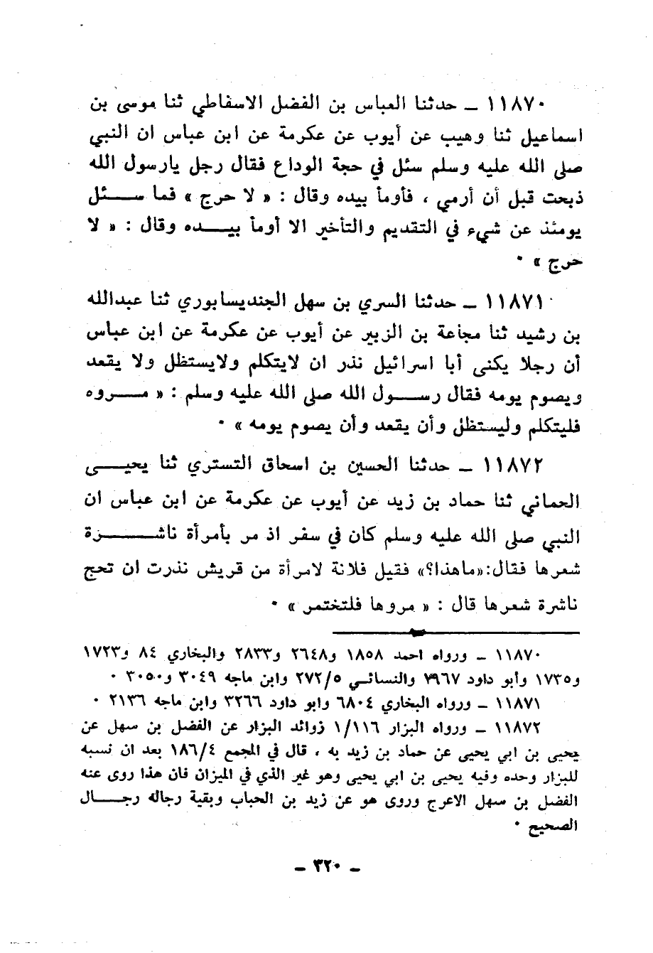 11870 - حَدَّثَنَا الْعَبَّاسُ بْنُ الْفَضْلِ الْأَسْفَاطِيُّ، ثنا مُوسَى بْنُ إِسْمَاعِيلَ، ثنا وُهَيْبٌ، عَنْ أَيُّوبَ، عَنْ عِكْرِمَةَ، عَنِ ابْنِ عَبَّاسٍ، أَنَّ النَّبِيَّ صَلَّى اللهُ عَلَيْهِ وَسَلَّمَ سُئِلَ فِي حَجَّةِ الْوَدَاعِ فَقَالَ رَجُلٌ: يَا رَسُولَ اللهِ ذَبَحْتُ قَبْلَ أَنْ أَرْمِيَ فَأَوْمَأَ بِيَدِهِ وَقَالَ: «§لَا حَرَجَ» فَمَا سُئِلَ يَوْمَئِذٍ عَنْ شَيْءٍ فِي التَّقْدِيمِ، وَالتَّأْخِيرِ إِلَّا أَوْمَأَ بِيَدِهِ وَقَالَ: «لَا حَرَجَ»