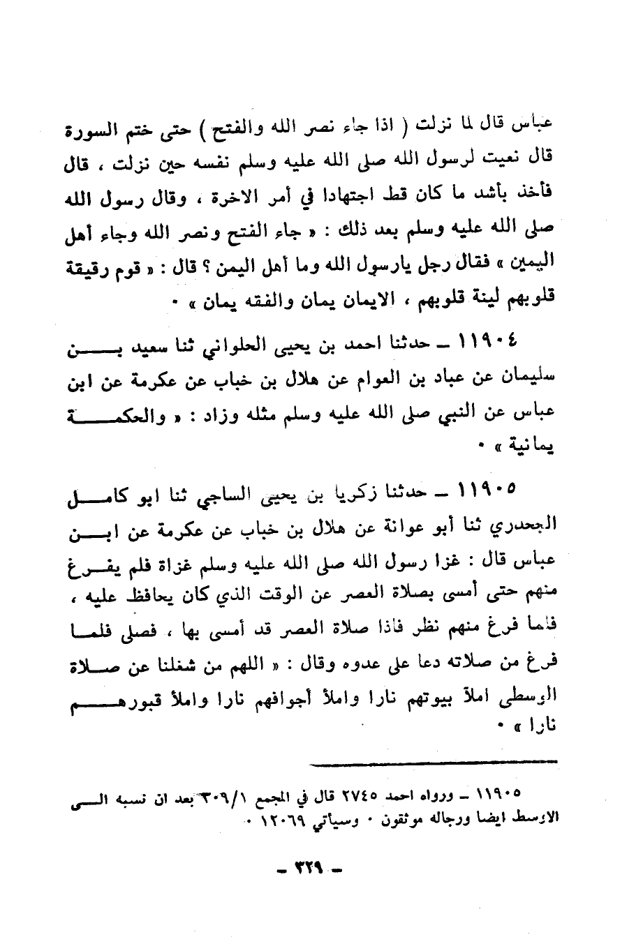 11905 - حَدَّثَنَا زَكَرِيَّا بْنُ يَحْيَى السَّاجِيُّ، ثنا أَبُو كَامِلٍ الْجَحْدَرِيُّ، ثنا أَبُو عَوَانَةَ، عَنْ هِلَالِ بْنِ خَبَّابٍ، عَنْ عِكْرِمَةَ، عَنِ ابْنِ عَبَّاسٍ، قَالَ: غَزَا رَسُولُ اللهِ صَلَّى اللهُ عَلَيْهِ وَسَلَّمَ غَزَاةً، فَلَمْ يَفْرُغْ مِنْهُمْ حَتَّى أَمْسَى بِصَلَاةِ الْعَصْرِ عَنِ الْوَقْتِ الَّذِي كَانَ يُحَافِظُ عَلَيْهِ، فَلَمَّا فَرَغَ مِنْهُمْ نَظَرَ فَإِذَا صَلَاةُ الْعَصْرِ قَدْ أُمْسِيَ بِهَا، فَصَلَّى فَلَمَّا فَرَغَ مِنْ صَلَاتِهِ دَعَا عَلَى عَدُوِّهِ وَقَالَ: «§اللهُمَّ، مَنْ شَغَلَنَا عَنْ صَلَاةِ الْوُسْطَى امْلَأْ بُيُوتَهُمْ نَارًا، وَامْلَأْ أَجْوَافَهُمْ نَارًا، وَامْلَأْ قُبُورَهُمْ نَارًا»