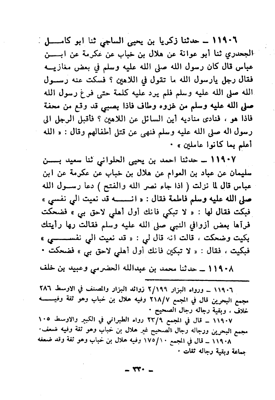 11906 - حَدَّثَنَا زَكَرِيَّا بْنُ يَحْيَى السَّاجِيُّ، ثنا أَبُو كَامِلٍ الْجَحْدَرِيُّ، ثنا أَبُو عَوَانَةَ، عَنْ هِلَالِ بْنِ خَبَّابٍ، عَنْ عِكْرِمَةَ، عَنِ ابْنِ عَبَّاسٍ، قَالَ: كَانَ رَسُولُ اللهِ صَلَّى اللهُ عَلَيْهِ وَسَلَّمَ فِي بَعْضِ مَغَازِيهِ فَقَالَ رَجُلٌ: يَا رَسُولَ اللهِ مَا تَقُولُ فِي اللاهينَ؟ فَسَكَتَ عَنْهُ رَسُولُ اللهِ صَلَّى اللهُ عَلَيْهِ وَسَلَّمَ فَلَمْ يَرُدَّ عَلَيْهِ كَلِمَةً حَتَّى فَرَغَ رَسُولُ اللهِ صَلَّى اللهُ عَلَيْهِ وَسَلَّمَ مِنْ غَزْوِهِ وَطَافَ، فَإِذَا بِصَبِيٍّ قَدْ وَقَعَ مِنْ مِحَفَّةٍ فَإِذَا هُوَ، فَنَادَى مُنَادِيهِ أَيْنَ السَّائِلُ عَنِ اللاهينَ؟ فَأَقْبَلَ الرَّجُلُ إِلَى رَسُولِ اللهِ صَلَّى اللهُ عَلَيْهِ وَسَلَّمَ، §فَنَهَى عَنْ قَتْلِ أَطْفَالِهِمْ وَقَالَ: «اللهُ أَعْلَمُ بِمَا كَانُوا عَامِلِينَ»