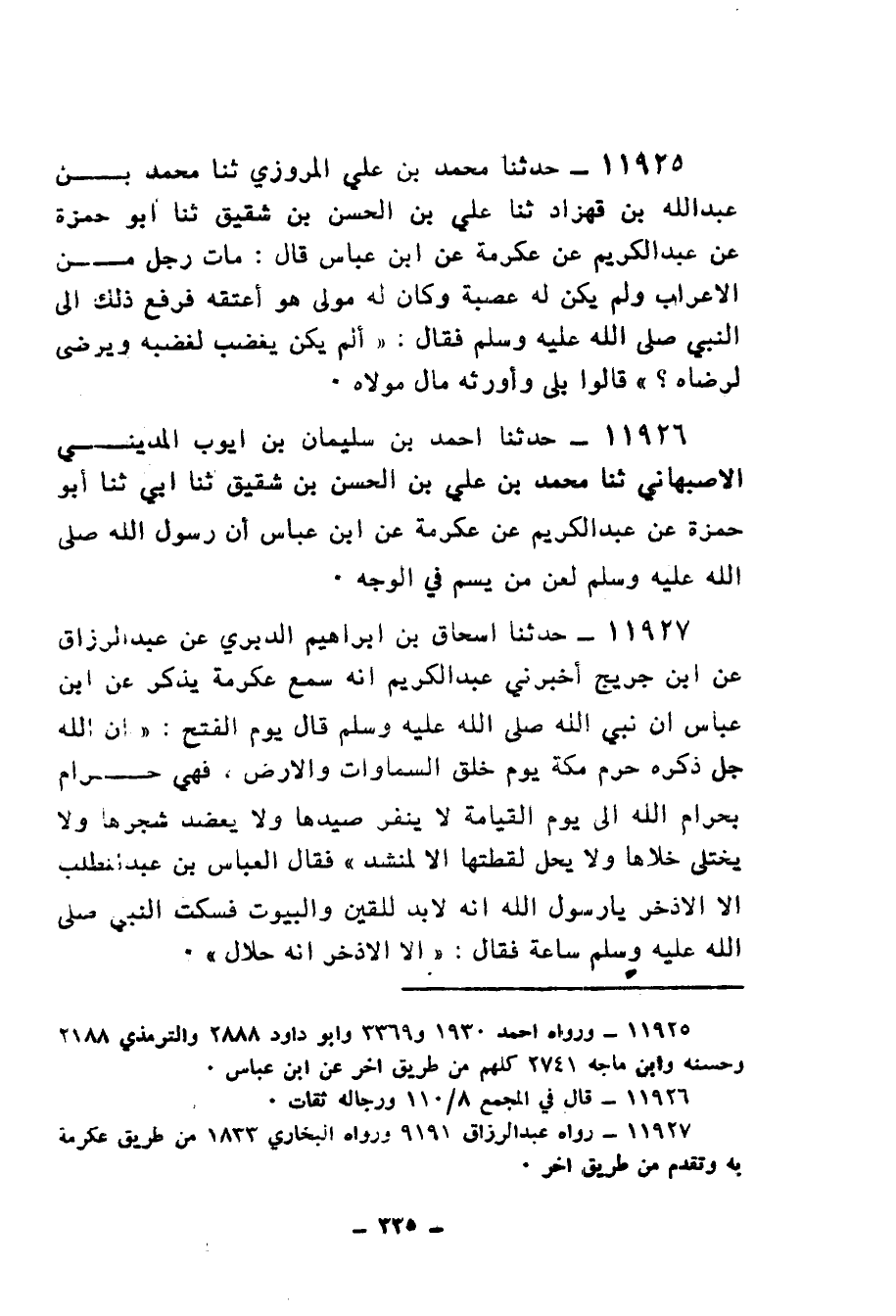 11925 - حَدَّثَنَا مُحَمَّدُ بْنُ عَلِيٍّ الْمَرْوَزِيُّ، ثنا مُحَمَّدُ بْنُ عَبْدِ اللهِ بْنِ قُهْزَاذٍ، ثنا عَلِيُّ بْنُ الْحَسَنِ بْنِ شَقِيقٍ، ثنا أَبُو حَمْزَةَ، عَنْ عَبْدِ الْكَرِيمِ، عَنْ عِكْرِمَةَ، عَنِ ابْنِ عَبَّاسٍ، قَالَ: مَاتَ رَجُلٌ مِنَ الْأَعْرَابِ وَلَمْ يَكُنْ لَهُ عَصَبَةٌ، وَكَانَ لَهُ مَوْلًى هُوَ أَعْتَقَهُ فَرُفِعَ ذَلِكَ إِلَى النَّبِيِّ صَلَّى اللهُ عَلَيْهِ وَسَلَّمَ فَقَالَ: «§أَلَمْ يَكُنْ يَغْضَبُ لِغَضَبِهِ وَيَرْضَى لرِضَاهُ؟» قَالُوا: بَلَى وأَوْرَثَهُ مَالَ مَوْلَاهُ