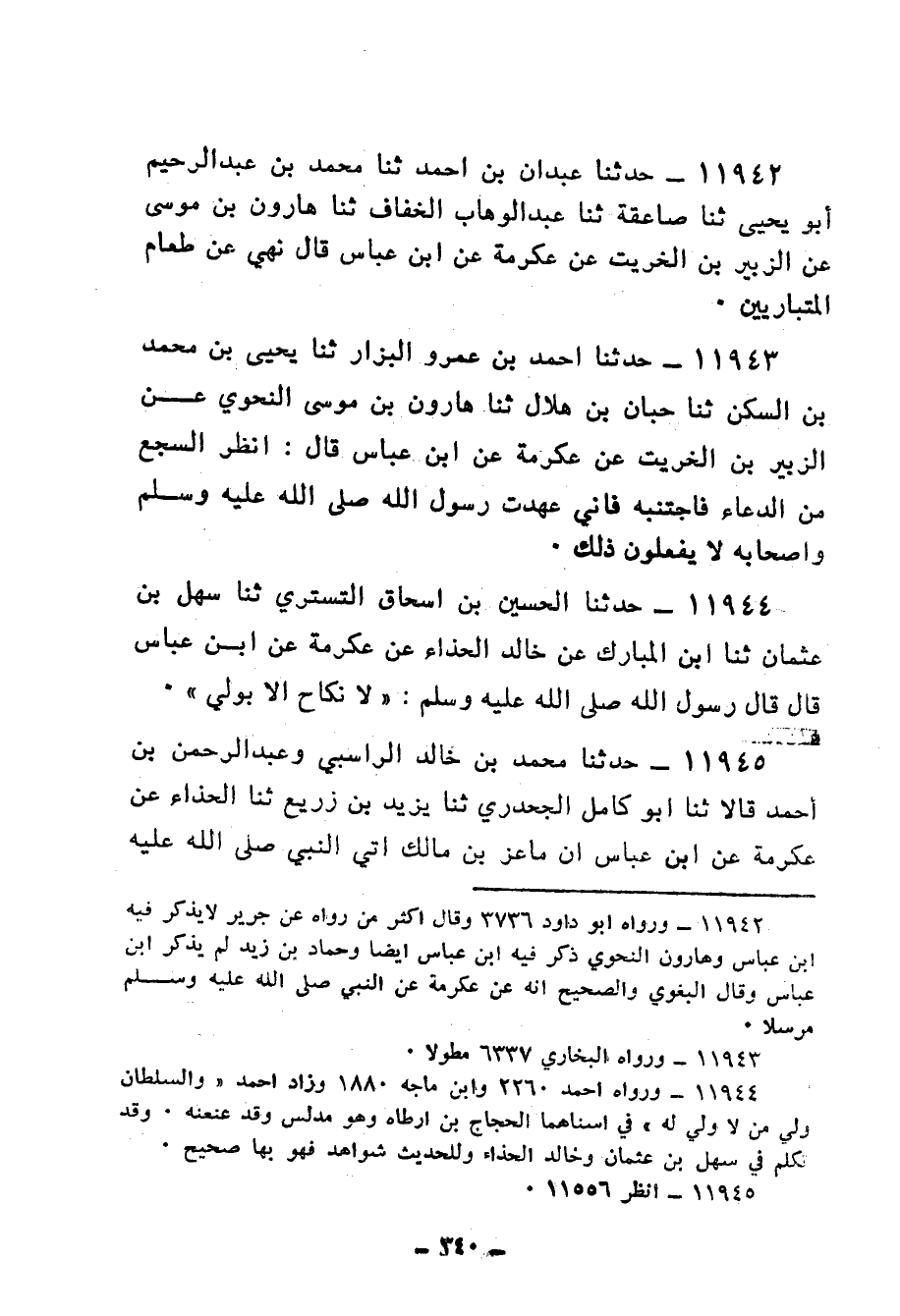 11944 - حَدَّثَنَا الْحُسَيْنُ بْنُ إِسْحَاقَ التُّسْتَرِيُّ، ثنا سَهْلُ بْنُ عُثْمَانَ، ثنا ابْنُ الْمُبَارَكِ، عَنْ خَالِدٍ الْحَذَّاءِ، عَنْ عِكْرِمَةَ، عَنِ ابْنِ عَبَّاسٍ، قَالَ: قَالَ رَسُولُ اللهِ صَلَّى اللهُ عَلَيْهِ وَسَلَّمَ: «§لَا نِكَاحَ إِلَّا بِوَلِيٍّ»