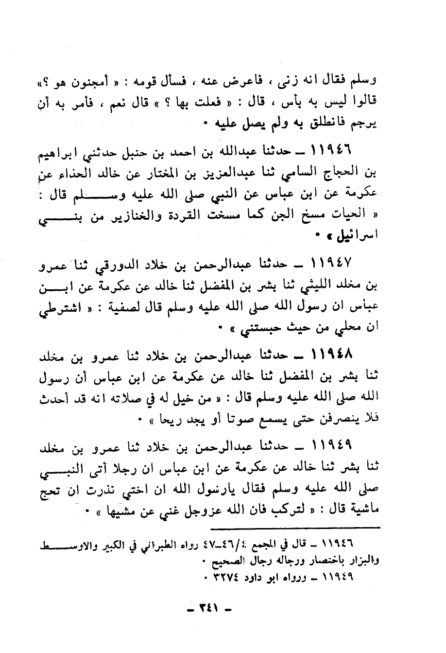 11946 - حَدَّثَنَا عَبْدُ اللهِ بْنُ أَحْمَدَ بْنِ حَنْبَلٍ، حَدَّثَنِي إِبْرَاهِيمُ بْنُ الْحَجَّاجِ السَّامِيُّ، ثنا عَبْدُ الْعَزِيزِ بْنُ الْمُخْتَارِ، عَنْ خَالِدٍ الْحَذَّاءِ، عَنْ عِكْرِمَةَ، عَنِ ابْنِ عَبَّاسٍ، عَنِ النَّبِيِّ صَلَّى اللهُ عَلَيْهِ وَسَلَّمَ قَالَ: «§الْحَيَّاتُ مَسْخُ الْجِنِّ كَمَا مُسِخَتِ الْقِرَدَةُ، وَالْخَنَازِيرُ مِنْ بَنِي إِسْرَائِيلَ»