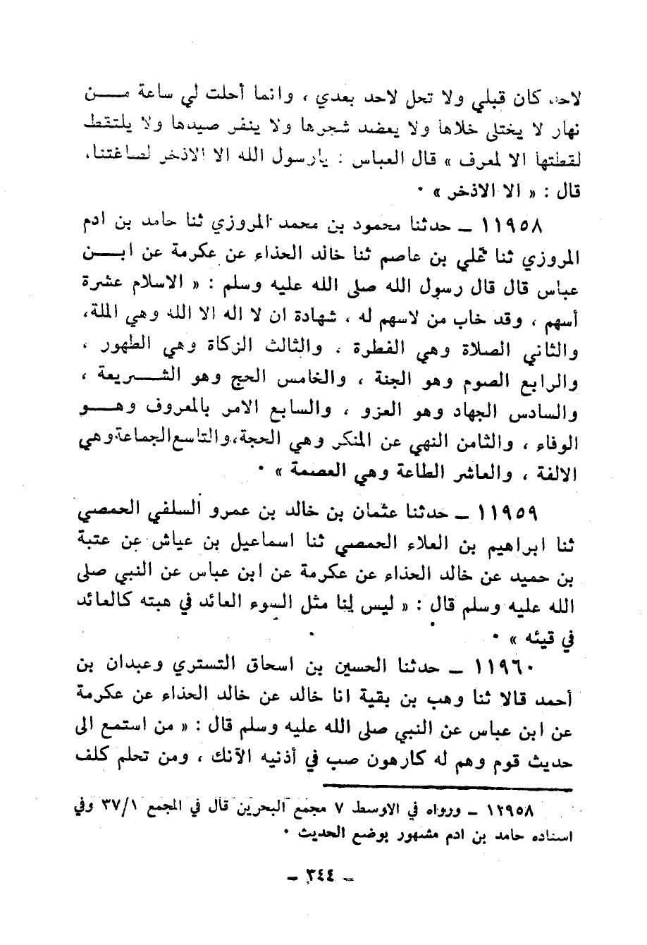 11958 - حَدَّثَنَا مَحْمُودُ بْنُ مُحَمَّدٍ الْمَرْوَزِيُّ، ثنا حَامِدُ بْنُ آدَمَ الْمَرْوَزِيُّ، ثنا عَلِيُّ بْنُ عَاصِمٍ، ثنا خَالِدٌ الْحَذَّاءُ، عَنْ عِكْرِمَةَ، عَنِ ابْنِ عَبَّاسٍ، قَالَ: قَالَ رَسُولُ اللهِ صَلَّى اللهُ عَلَيْهِ وَسَلَّمَ: " §الْإِسْلَامُ عَشَرَةُ أَسْهُمٍ، وَقَدْ خَابَ مَنْ لَا سَهْمَ لَهُ: شَهَادَةُ أَنْ لَا إِلَهَ إِلَّا اللهُ، وَهِيَ الْمِلَّةُ، وَالثَّانِي الصَّلَاةُ، وَهِيَ الْفِطْرَةُ، وَالثَّالِثُ الزَّكَاةُ، وَهِيَ الطُّهُورُ، وَالرَّابِعُ الصَّوْمُ، وَهُوَ الْجُنَّةُ، وَالْخَامِسُ الْحَجُّ، وَهُوَ الشَّرِيعَةُ، وَالسادسُ الْجِهَادُ، وَهُوَ الْغَزْوُ، وَالسابعُ الْأَمْرُ بِالْمَعْرُوفِ وَهُوَ الْوَفَاءُ، وَالثامِنُ النَّهْيُ عَنِ الْمُنْكَرِ وَهِيَ الْحُجَّةُ، وَالتاسعُ الْجَمَاعَةُ، وَهِيَ الْأُلْفَةُ، وَالْعَاشِرُ الطَّاعَةُ، وَهِيَ الْعِصْمَةُ "
