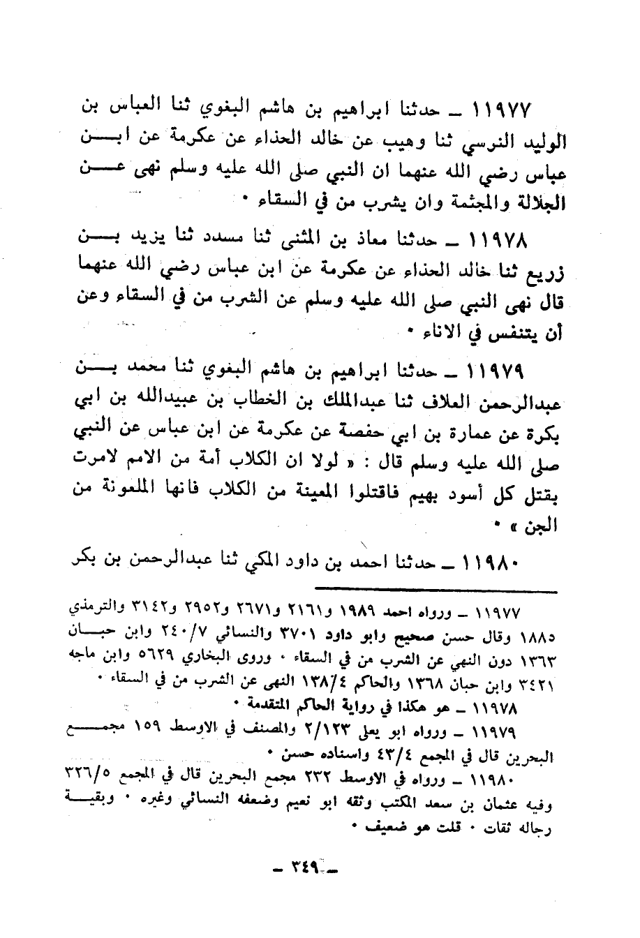 11979 - حَدَّثَنَا إِبْرَاهِيمُ بْنُ هَاشِمٍ الْبَغَوِيُّ، ثنا مُحَمَّدُ بْنُ عَبْدِ الرَّحْمَنِ الْعَلَّافُ، ثنا عَبْدُ الْمَلِكِ بْنُ الْخَطَّابِ بْنِ عُبَيْدِ اللهِ بْنِ أَبِي بَكْرَةَ، عَنْ عُمَارَةَ بْنِ أَبِي حَفْصَةَ، عَنْ عِكْرِمَةَ، عَنِ ابْنِ عَبَّاسٍ، عَنِ النَّبِيِّ صَلَّى اللهُ عَلَيْهِ وَسَلَّمَ قَالَ: «§لَوْلَا أَنَّ الْكِلَابَ أُمَّةٌ مِنَ الْأُمَمِ لَأَمَرْتُ بِقَتْلِ كُلِّ أَسْوَدَ بَهِيمٍ، فَاقْتُلُوا الْمعينةَ مِنَ الْكِلَابِ، فَإِنَّهَا الْمَلْعُونَةُ مِنَ الْجِنِّ»