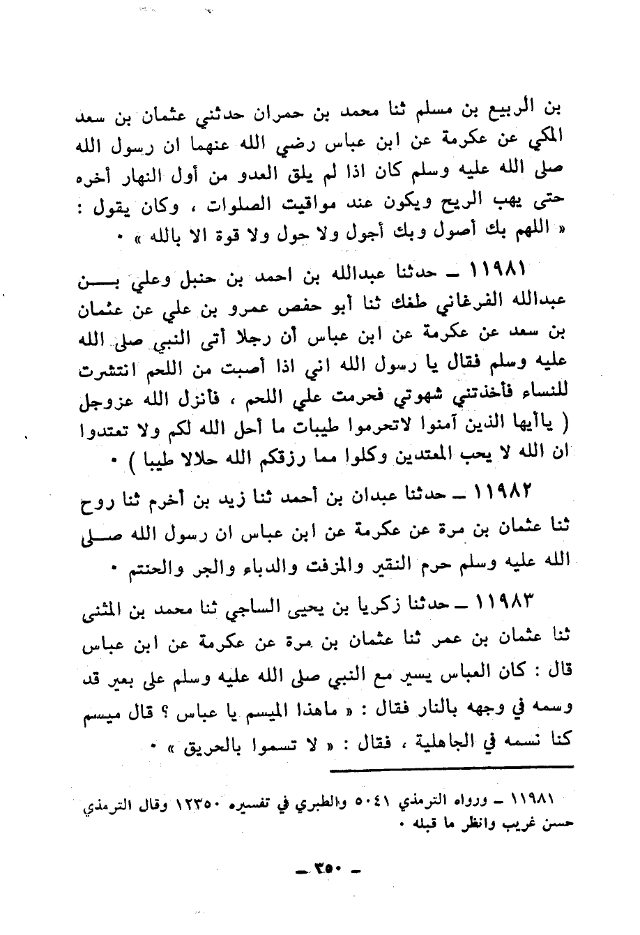 11981 - حَدَّثَنَا عَبْدُ اللهِ بْنُ أَحْمَدَ بْنِ حَنْبَلٍ، وَعَلِيُّ بْنُ عَبْدِ اللهِ الْفرْغَانِيُّ طُغْكُ، ثنا أَبُو حَفْصٍ عَمْرُو بْنُ عَلِيٍّ، عَنْ عُثْمَانَ بْنِ سَعْدٍ، عَنْ عِكْرِمَةَ، عَنِ ابْنِ عَبَّاسٍ، أَنَّ رَجُلًا أَتَى النَّبِيَّ صَلَّى اللهُ عَلَيْهِ وَسَلَّمَ فَقَالَ: «يَا رَسُولَ اللهِ إِنِّي §إِذَا أَصَبْتُ مِنَ اللَّحْمِ انْتَشَرَتُ لِلنِّسَاءِ فَأَخَذَتْنِي شَهْوَتِي فَحَرَّمْتُ عَلِيَّ اللَّحْمَ» ، فَأَنْزَلَ اللهُ عَزَّ وَجَلَّ {يَا أَيُّهَا الَّذِينَ آمَنُوا لَا تُحَرِّمُوا طَيِّبَاتِ مَا أَحَلَّ اللهُ لَكُمْ وَلَا تَعْتَدُوا إِنَّ اللهَ لَا يُحِبُّ الْمُعْتَدِينَ وَكُلُوا مِمَّا رِزْقَكُمِ اللهُ حَلَالًا طَيِّبًا} [المائدة: 88]