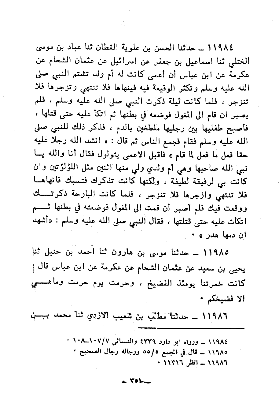11984 - حَدَّثَنَا الْحَسَنُ بْنُ عَلَوَيْهِ الْقَطَّانُ، ثنا عَبَّادُ بْنُ مُوسَى الْخُتُلِّيُّ، ثنا إِسْمَاعِيلُ بْنُ جَعْفَرٍ، عَنْ إِسْرَائِيلَ، عَنْ عُثْمَانَ الشَّحَّامِ، عَنْ عِكْرِمَةَ، عَنِ ابْنِ عَبَّاسٍ، أَنَّ أَعْمَى كَانَتْ لَهُ أُمُّ وَلَدٍ تَشْتُمُ النَّبِيَّ صَلَّى اللهُ عَلَيْهِ وَسَلَّمَ، وَتُكْثِرُ الْوَقِيعَةَ فِيهِ، فَيَنْهَاهَا فَلَا تَنْتَهِي، وَيَزْجُرُهَا فَلَا تَنْزَجِرُ، فَلَمَّا كَانَتْ لَيْلَةٌ ذَكَرْتِ النَّبِيَّ صَلَّى اللهُ عَلَيْهِ وَسَلَّمَ، فَلَمْ يَصْبِرْ أَنْ قَامَ إِلَى الْمِغْوَلِ فَوَضَعَهُ فِي بَطْنِهَا، ثُمَّ اتَّكَأَ عَلَيْهَا حَتَّى قَتَلَهَا، فَأَصْبَحَ طِفْلَيْهَا بَيْنَ رِجْلَيْهَا مُلَطْخَيْنِ بِالدَّمِ، فَذَكَرَ ذَلِكَ لِلنَّبِيِّ صَلَّى اللهُ عَلَيْهِ وَسَلَّمَ فَقَامَ فَجَمَعَ النَّاسَ ثُمَّ قَالَ: «أَنْشُدُ اللهَ رَجُلًا عَلَيْهِ حَقٌّ فَعَلَ مَا فَعَلَ لَمَا قَامَ» فَأَقْبَلَ الْأَعْمَى يَتَوَلْوَلُ فَقَالَ: أَنَا وَاللهِ يَا نَبِيَّ اللهِ صَاحِبُهَا وَهِيَ أُمُّ وَلَدِي وَلِي مِنْهَا اثْنَانِ مِثْلُ اللُّؤْلُؤَتَيْنِ، وَإِنْ كَانَتْ بِي لرَفِيقَةٌ لَطِيفَةٌ، وَلَكِنَّهَا كَانَتْ تَذْكُرُكَ فَتَسُبُّكَ، فَأَنْهَاهَا فَلَا تَنْتَهِي، وَأَزْجُرُهَا فَلَا تَنْزَجِرُ، فَلَمَّا كَانَتِ الْبَارِحَةُ ذَكَرَتْكَ وَوَقَعَتْ فِيكَ فَلَمْ أَصْبِرْ أَنْ قُمْتُ إِلَى الْمِغْوَلِ فَوَضَعْتُهُ فِي بَطْنِهَا، ثُمَّ اتَّكَأْتُ عَلَيْهِ حَتَّى قَتَلْتُهَا، فَقَالَ النَّبِيُّ صَلَّى اللهُ عَلَيْهِ وَسَلَّمَ: «§أَشْهَدُ أَنَّ دَمَهَا هَدَرٌ»
