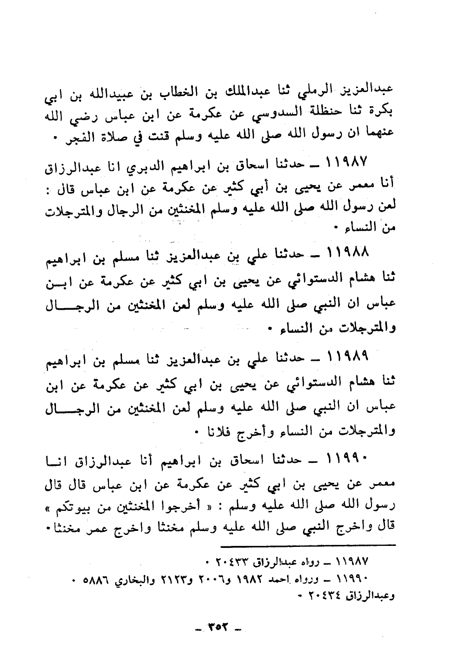 11988 - حَدَّثَنَا عَلِيُّ بْنُ عَبْدِ الْعَزِيزِ، ثنا مُسْلِمُ بْنُ إِبْرَاهِيمَ، ثنا هِشَامٌ الدَّسْتُوَائِيُّ، عَنْ يَحْيَى بْنِ أَبِي كَثِيرٍ، عَنْ عِكْرِمَةَ، عَنِ ابْنِ عَبَّاسٍ، أَنَّ النَّبِيَّ صَلَّى اللهُ عَلَيْهِ وَسَلَّمَ «§لَعَنَ الْمُخَنَّثِينَ مِنَ الرِّجَالِ، وَالْمُتَرَجِّلَاتِ مِنَ النِّسَاءِ»