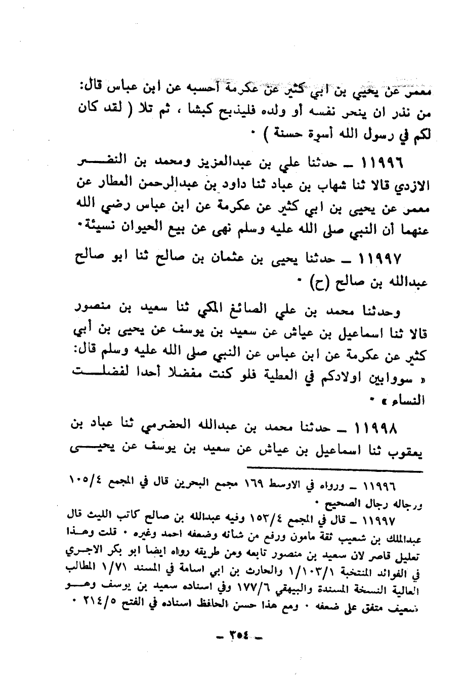 11997 - حَدَّثَنَا يَحْيَى بْنُ عُثْمَانَ بْنِ صَالِحٍ، ثنا أَبُو صَالِحٍ عَبْدُ اللهِ بْنُ صَالِحٍ، ح، وَحَدَّثَنَا مُحَمَّدُ بْنُ عَلِيٍّ الصَّائِغُ الْمَكِّيُّ، ثنا سَعِيدُ بْنُ مَنْصُورٍ، قَالَا: ثنا إِسْمَاعِيلُ بْنُ عَيَّاشٍ، عَنْ سَعِيدِ بْنِ يُوسُفَ، عَنْ يَحْيَى بْنِ أَبِي كَثِيرٍ، عَنْ عِكْرِمَةَ، عَنِ ابْنِ عَبَّاسٍ، عَنِ النَّبِيِّ صَلَّى اللهُ عَلَيْهِ وَسَلَّمَ قَالَ: «§سَوُّوا بَيْنَ أَوْلَادِكُمْ فِي الْعَطِيَّةِ فَلَوْ كُنْتُ مُفَضِّلًا أَحَدًا لَفَضَّلْتُ النِّسَاءَ»