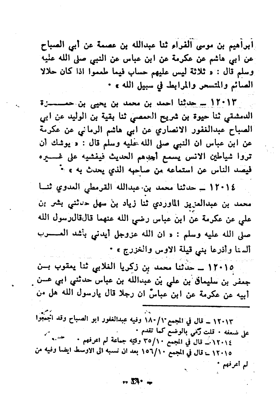 12013 - حَدَّثَنَا أَحْمَدُ بْنُ مُحَمَّدِ بْنِ يَحْيَى بْنِ حَمْزَةَ الدِّمَشْقِيُّ، ثنا حَيْوَةُ بْنُ شُرَيْحٍ الْحِمْصِيُّ، ثنا بَقِيَّةُ بْنُ الْوَلِيدِ، عَنْ أَبِي الصَّبَّاحِ عَبْدِ الْغَفُورِ الْأَنْصَارِيِّ، عَنْ أَبِي هَاشِمٍ الرُّمَّانِيِّ، عَنْ عِكْرِمَةَ، عَنِ ابْنِ عَبَّاسٍ، أَنَّ النَّبِيَّ صَلَّى اللهُ عَلَيْهِ وَسَلَّمَ قَالَ: «§يُوشَكُ أَنْ تَرَوْا شَيَاطِينَ الْإِنْسِ يَسْمَعُ أَحَدُهُمُ الْحَدِيثَ، فَيُفْشيهِ عَلَى غَيْرِهِ، فَيَصُدُّ النَّاسَ عَنِ اسْتِماعِهِ مِنْ صَاحِبِهِ الَّذِي يُحَدِّثُ بِهِ»