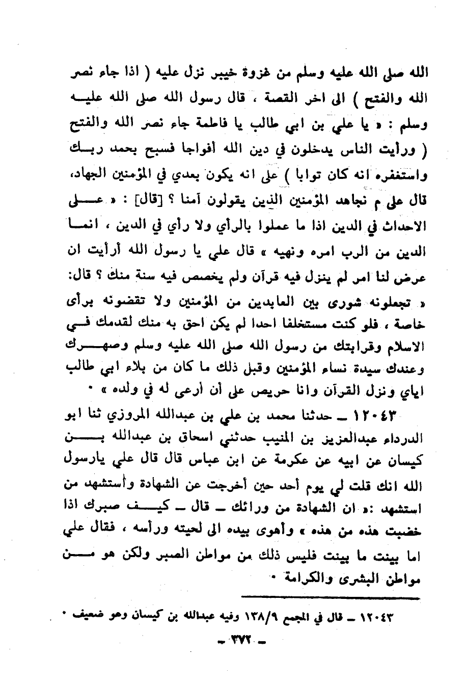 12043 - حَدَّثَنَا مُحَمَّدُ بْنُ عَلِيِّ بْنِ عَبْدِ اللهِ الْمَرْوَزِيُّ، ثنا أَبُو الدَّرْدَاءِ عَبْدُ الْعَزِيزِ بْنُ الْمُنِيبِ، حَدَّثَنِي إِسْحَاقُ بْنُ عَبْدِ اللهِ بْنِ كَيْسَانَ، عَنْ أَبِيهِ، عَنْ عِكْرِمَةَ، عَنِ ابْنِ عَبَّاسٍ، قَالَ: قَالَ عَلِيٌّ: يَا رَسُولَ اللهِ إِنَّكَ قُلْتَ لِي يَوْمَ أَحَدٍ حِينَ أُخْرِجْتُ عَنِ الشَّهَادَةِ وَاسْتُشْهِدَ مَنِ اسْتُشْهِدَ: «إِنَّ §الشَّهَادَةَ مِنْ ورائِكَ قَالَ كَيْفَ صَبْرُكَ إِذَا خُضِبَتْ هَذِهِ مِنْ هَذِهِ وَأَهْوَى بِيَدِهِ إِلَى لِحْيَتِهِ وَرَأْسِهِ» فَقَالَ عَلِيٌّ: أَمَا بَيَّنْتَ مَا بَيَّنْتَ فَلَيْسَ ذَلِكَ مِنْ مَوَاطِنِ الصَّبْرِ، وَلَكِنْ هُوَ مِنْ مَوَاطِنِ الْبُشْرَى وَالْكَرَامَةِ