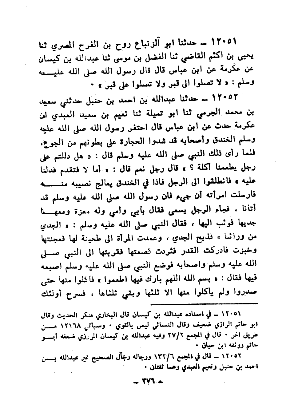 12052 - حَدَّثَنَا عَبْدُ اللهِ بْنُ أَحْمَدَ بْنِ حَنْبَلٍ، حَدَّثَنِي سَعِيدُ بْنُ مُحَمَّدٍ الْجَرْمِيُّ، ثنا أَبُو تُمَيْلَةَ، ثنا نُعَيْمُ بْنُ سَعِيدٍ الْعَبْدِيُّ، أَنَّ عِكْرِمَةَ حَدَّثَ، عَنِ ابْنِ عَبَّاسٍ، قَالَ: احْتَفَرَ رَسُولُ اللهِ صَلَّى اللهُ عَلَيْهِ وَسَلَّمَ الْخَنْدَقَ وَأَصْحَابُهُ قَدْ شُدُّوا الْحِجَارَةَ عَلَى بُطُونِهِمْ مِنَ الْجُوعِ، فَلَمَّا رَأَى ذَلِكَ النَّبِيُّ صَلَّى اللهُ عَلَيْهِ وَسَلَّمَ قَالَ: «§هَلْ دُلِلْتُمْ عَلَى رَجُلٍ يُطْعِمُنَا أَكَلَةً؟» قَالَ رَجُلٌ: نَعَمْ، قَالَ: «أَمَا لَا فَتَقَدَّمْ فَدُلَّنَا عَلَيْهِ» فَانْطَلَقُوا إِلَى الرَّجُلِ فَإِذَا فِي الْخَنْدَقِ يُعَالِجُ نَصِيبَهُ مِنْهُ، فَأَرْسَلَتِ امْرَأَتُهُ أَنْ جئْ فَإِنَّ رَسُولَ اللهِ صَلَّى اللهُ عَلَيْهِ وَسَلَّمَ قَدْ أَتَانَا، فَجَاءَ الرَّجُلُ يَسْعَى، فَقَالَ: بِأَبِي وَأُمِّي وَلَهُ مَعْزَةٌ وَمَعَهَا جَدْيُها، فَوَثَبَ إِلَيْهَا، فَقَالَ النَّبِيُّ صَلَّى اللهُ عَلَيْهِ وَسَلَّمَ: «الْجَدْيُ مِنْ وَرَائِنَا» فَذَبَحَ الْجَدْيَ، وعَمَدَتِ الْمَرْأَةُ إِلَى طَحِينَةٍ لَهَا فَعَجَنَتْها وَخَبَزَتْ فَأَدْرَكَتِ الْقِدْرَ فَثَرَدَتْ قَصْعَتَهَا، فَقَرَّبَتْها إِلَى النَّبِيِّ صَلَّى اللهُ عَلَيْهِ وَسَلَّمَ وَأَصْحَابِهِ، فَوَضَعَ النَّبِيُّ صَلَّى اللهُ عَلَيْهِ وَسَلَّمَ إِصْبَعَهُ فِيهَا، فَقَالَ:: «بِسْمِ اللهِ اللهُمَّ بَارِكْ فِيهَا اطْعَمُوا» فَأَكَلُوا مِنْهَا حَتَّى صَدَرُوا وَلَمْ يَأْكُلُوا مِنْهَا إِلَّا ثُلُثَهَا وَبَقِي ثُلُثَاهَا، فَسَرَّحَ أُولَئِكَ الْعَشَرَةَ الَّذِينَ كَانُوا مَعَهُ أَنِ اذْهَبُوا وسَرِّحُوا إِلَيْنَا بِعِدَّتِكُمْ فَذَهَبُوا وَجَاءَ أُولَئِكَ الْعَشَرَةُ مَكَانَهُمْ فَأَكَلُوا مِنْهَا حَتَّى شَبِعُوا، ثُمَّ قَامَ وَدَعَا لِرَبَّةِ الْبَيْتِ وَسَمَّتَ عَلَيْهَا وَعَلَى أَهْلِ بَيْتِهَا، ثُمَّ تَمَشَّوْا إِلَى الْخَنْدَقِ فَقَالَ: اذْهَبُوا بِنَا إِلَى سَلْمَانَ فَإِذَا صَخْرَةٌ بَيْنَ يَدَيْهِ قَدْ ضَعُفَ عَنْهَا، فَقَالَ نَبِيُّ اللهِ صَلَّى اللهُ عَلَيْهِ وَسَلَّمَ لِأَصْحَابِهِ: «دَعُونِي فَأَكُونُ أَوَّلَ مَنْ ضَرَبَهَا» فَقَالَ: «بِسْمِ اللهِ» فَضَرَبَهَا فَوَقَعَتْ فِلْقَةٌ ثُلُثُهَا فَقَالَ: «اللهُ أَكْبَرُ قُصُورُ الرُّومِ وَرَبِّ الْكَعْبَةِ» ثُمَّ ضَرَبَ بِأُخْرَى فَوَقَعَتْ فِلْقَةٌ فَقَالَ: «اللهُ أَكْبَرُ قُصُورُ فَارِسَ وَرَبِّ الْكَعْبَةِ» فَقَالَ عِنْدَهَا الْمُنَافِقُونَ: نَحْنُ نُخَنْدِقُ عَلَى أَنْفُسِنَا وَهُوَ يَعِدُنا قُصُورَ فَارِسٍ وَالرُّومِ