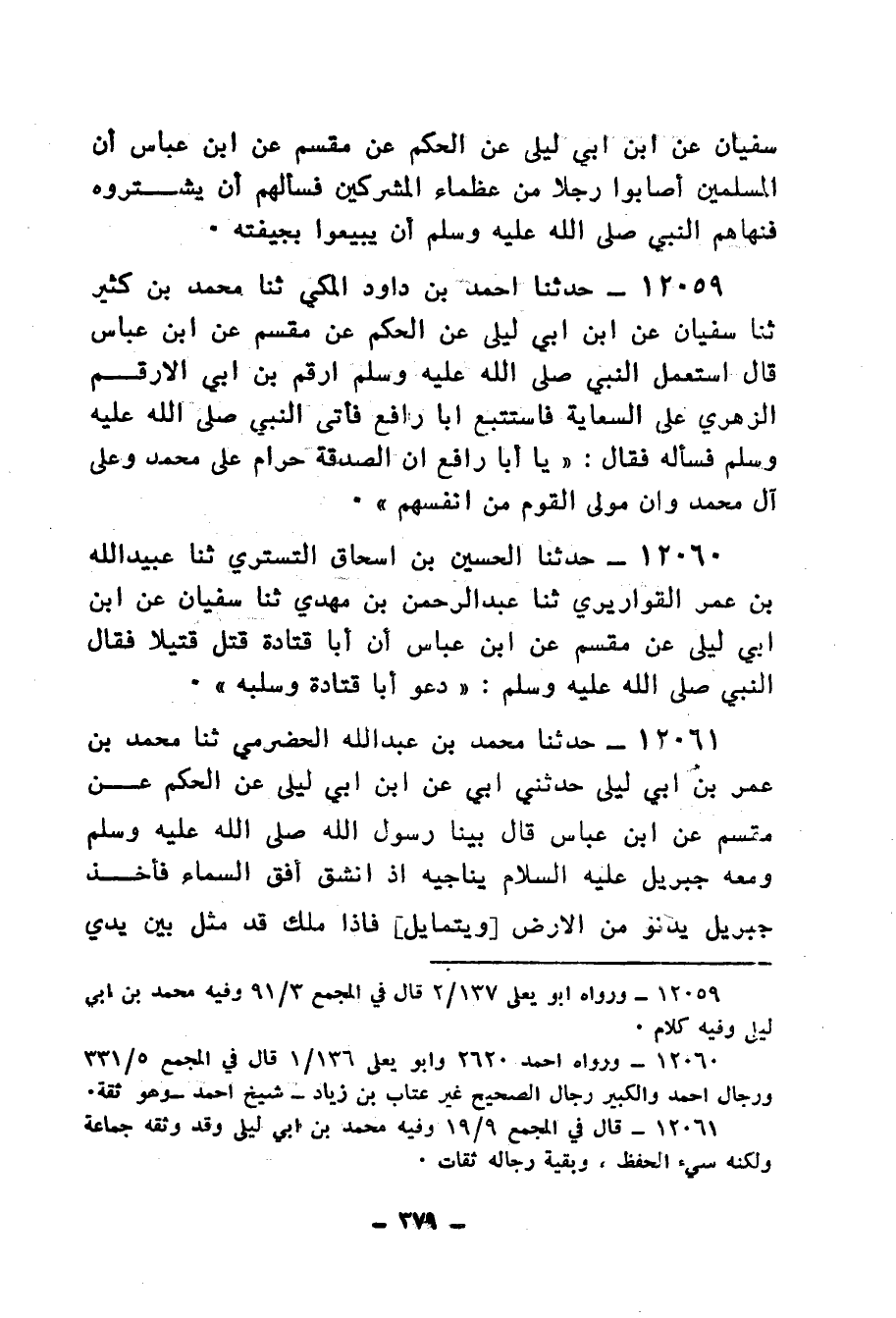 12059 - حَدَّثَنَا أَحْمَدُ بْنُ دَاوُدَ الْمَكِّيُّ، ثنا مُحَمَّدُ بْنُ كَثِيرٍ، ثنا سُفْيَانُ، عَنِ ابْنِ أَبِي لَيْلَى، عَنِ الْحَكَمِ، عَنْ مِقْسَمٍ، عَنِ ابْنِ عَبَّاسٍ، قَالَ اسْتَعْمَلَ النَّبِيُّ صَلَّى اللهُ عَلَيْهِ وَسَلَّمَ أَرْقَمَ بْنَ أَبِي الْأَرْقَمِ الزُّهْرِيَّ عَلَى السِّعَايَةِ فاستتبعَ أَبَا رَافِعٍ، فَأَتَى النَّبِيَّ صَلَّى اللهُ عَلَيْهِ وَسَلَّمَ فَسَأَلَهُ فَقَالَ: «يَا أَبَا رَافِعٍ إِنَّ §الصَّدَقَةَ حَرَامٌ عَلَى مُحَمَّدٍ وَعَلَى آلِ مُحَمَّدٍ وَإِنَّ مَوْلَى الْقَوْمِ مِنْ أَنْفُسِهِمْ»